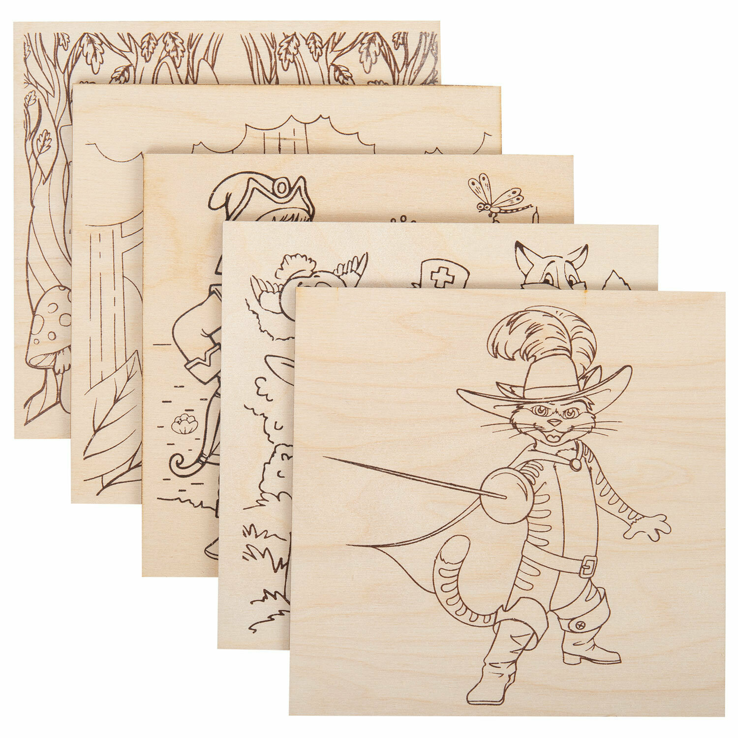 Купить Набор для выжигания по дереву, деревянные заготовки для творчества Сказочные мотивы, 5 штук 10 рисунков, 15x15 см, Brauberg Hobby, 665306