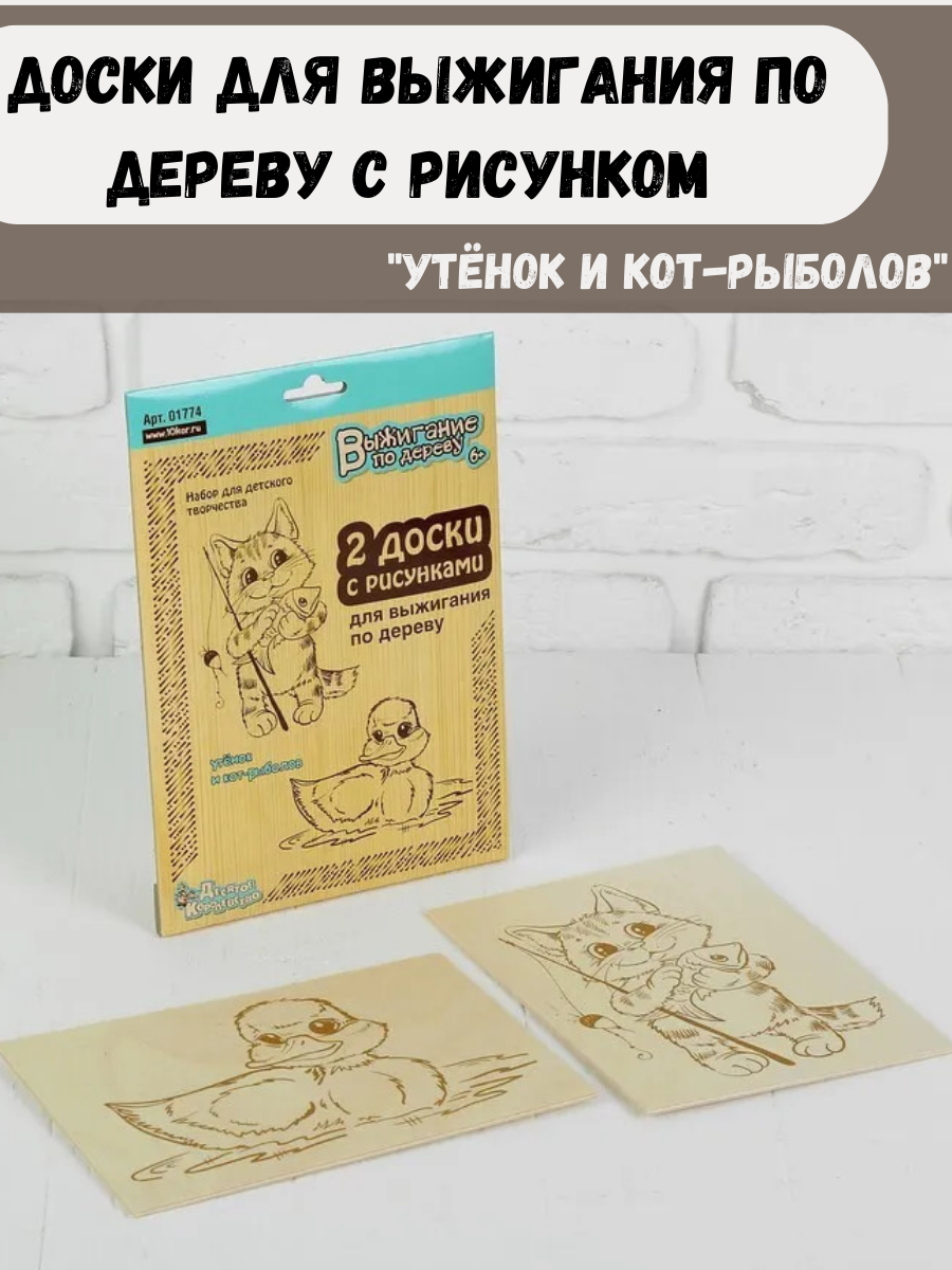 Доски для выжигания по дереву с рисунком "Утёнок и кот-рыболов" 2 шт. / Детский набор для творчества интересное: