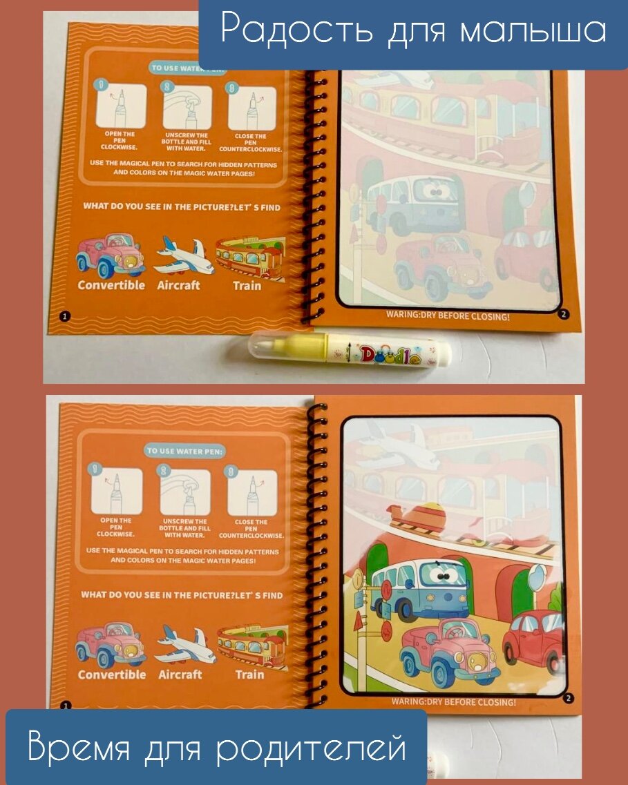 Купить Многоразовая водная раскраска с маркером Magic Water Book Машинки транспорт