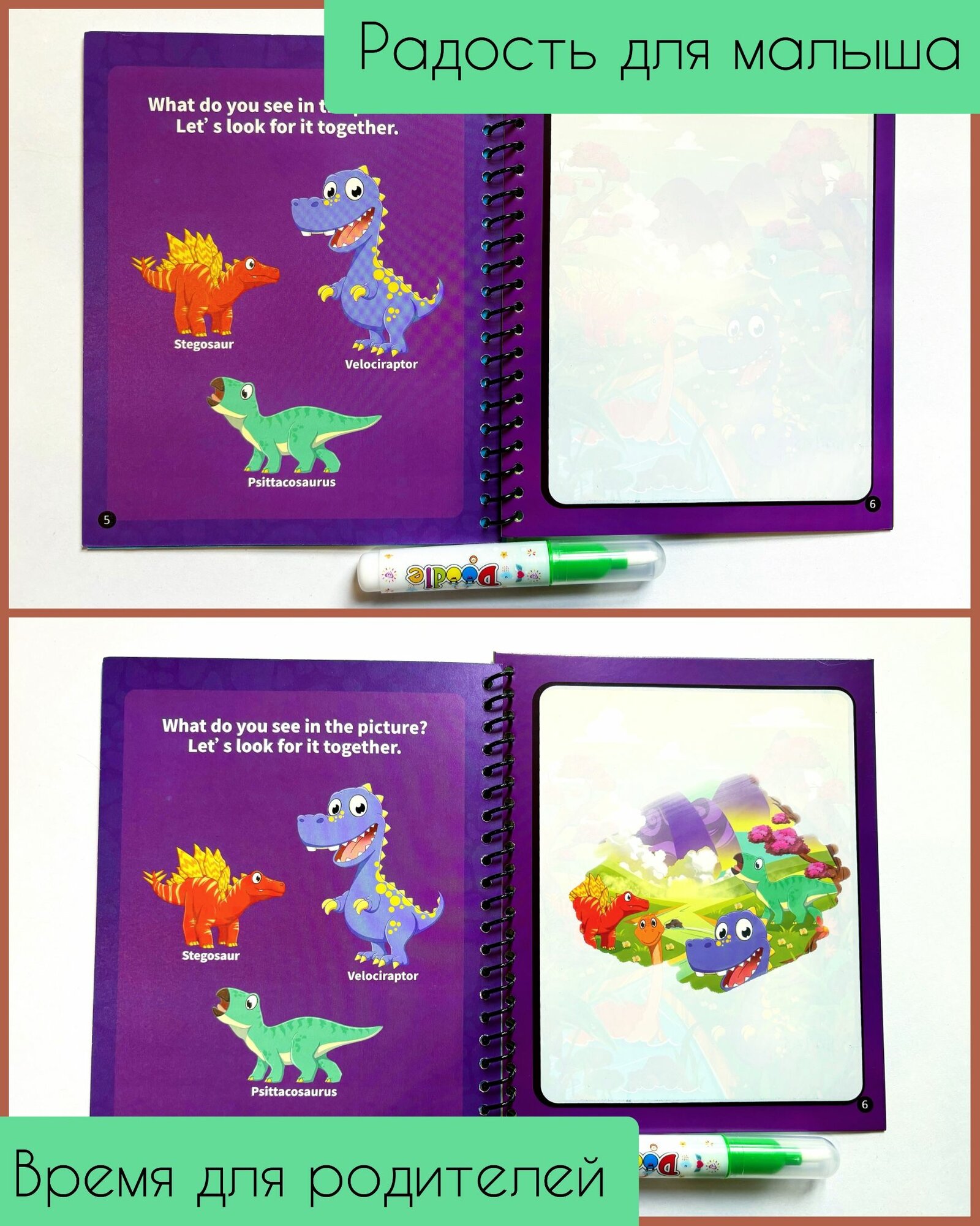 Многоразовая водная раскраска с маркером Magic Water Book Динозаврики интересное:
