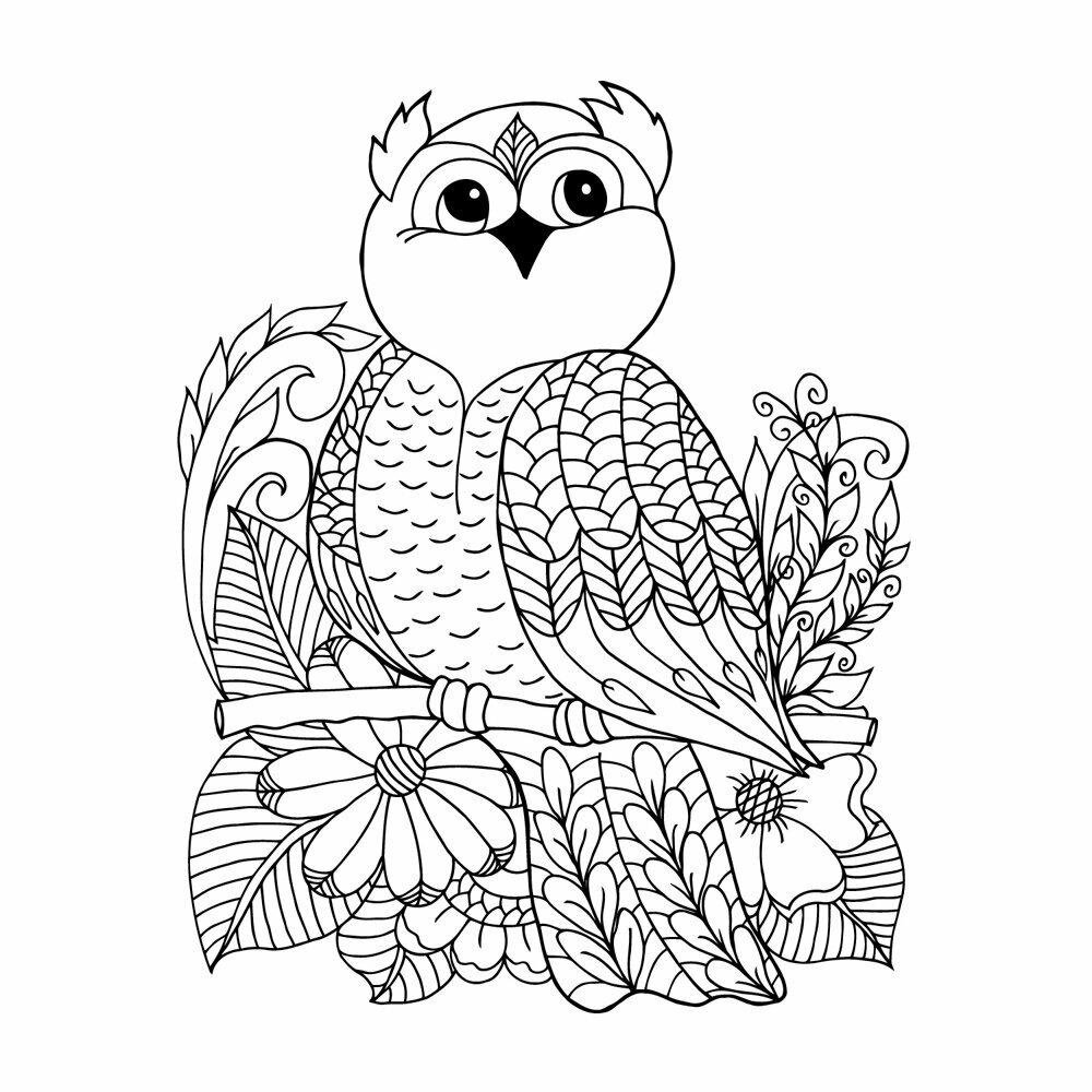 Антистресс-раскраска, Раскраска для детей. Сова и волшебный лес