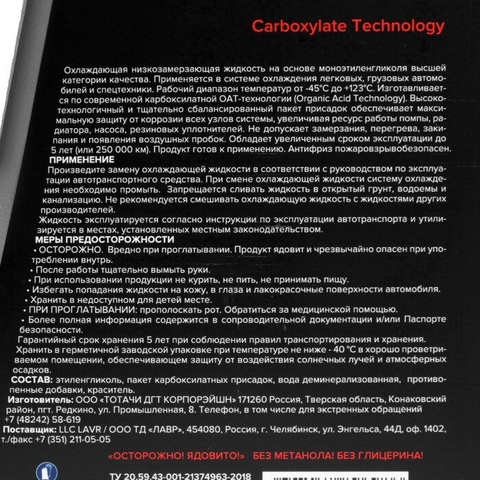 Lavr Охлаждающая Жидкость Antifreeze Lavr -45 G12+ Красный (5Kg) LAVR арт. LN1710
