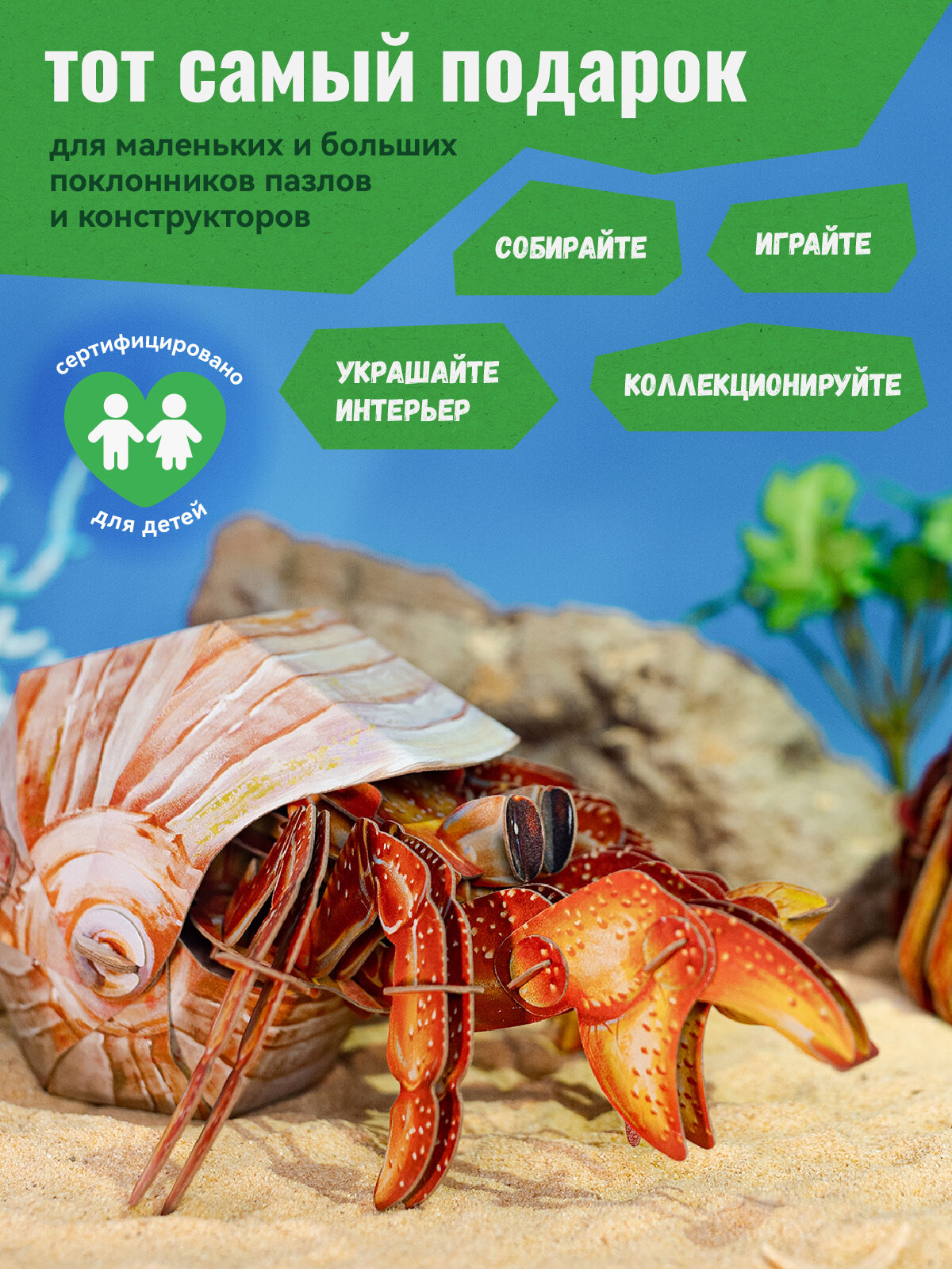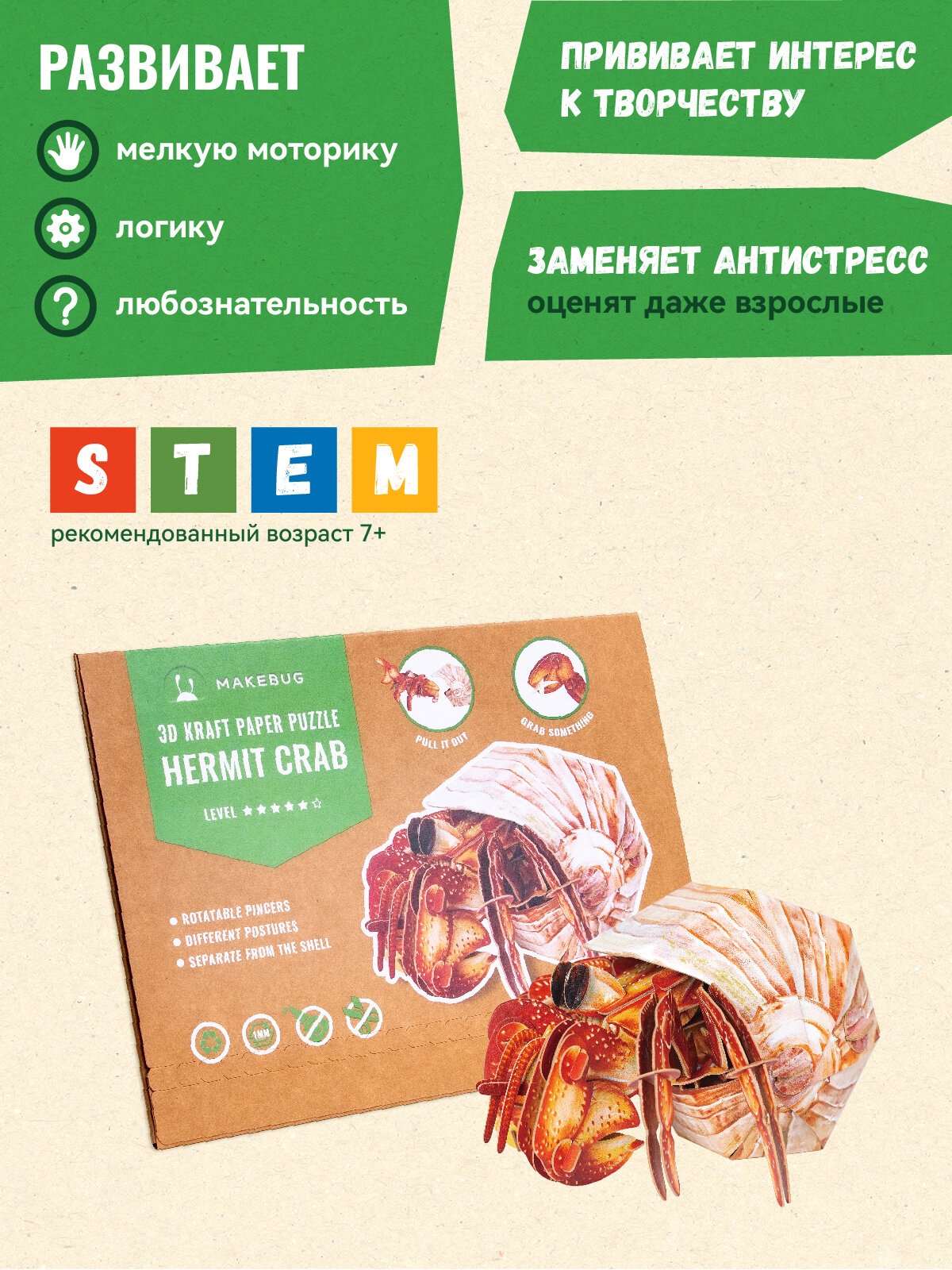 Картонный 3д пазл конструктор Makebug Рак отшельник интересное:
