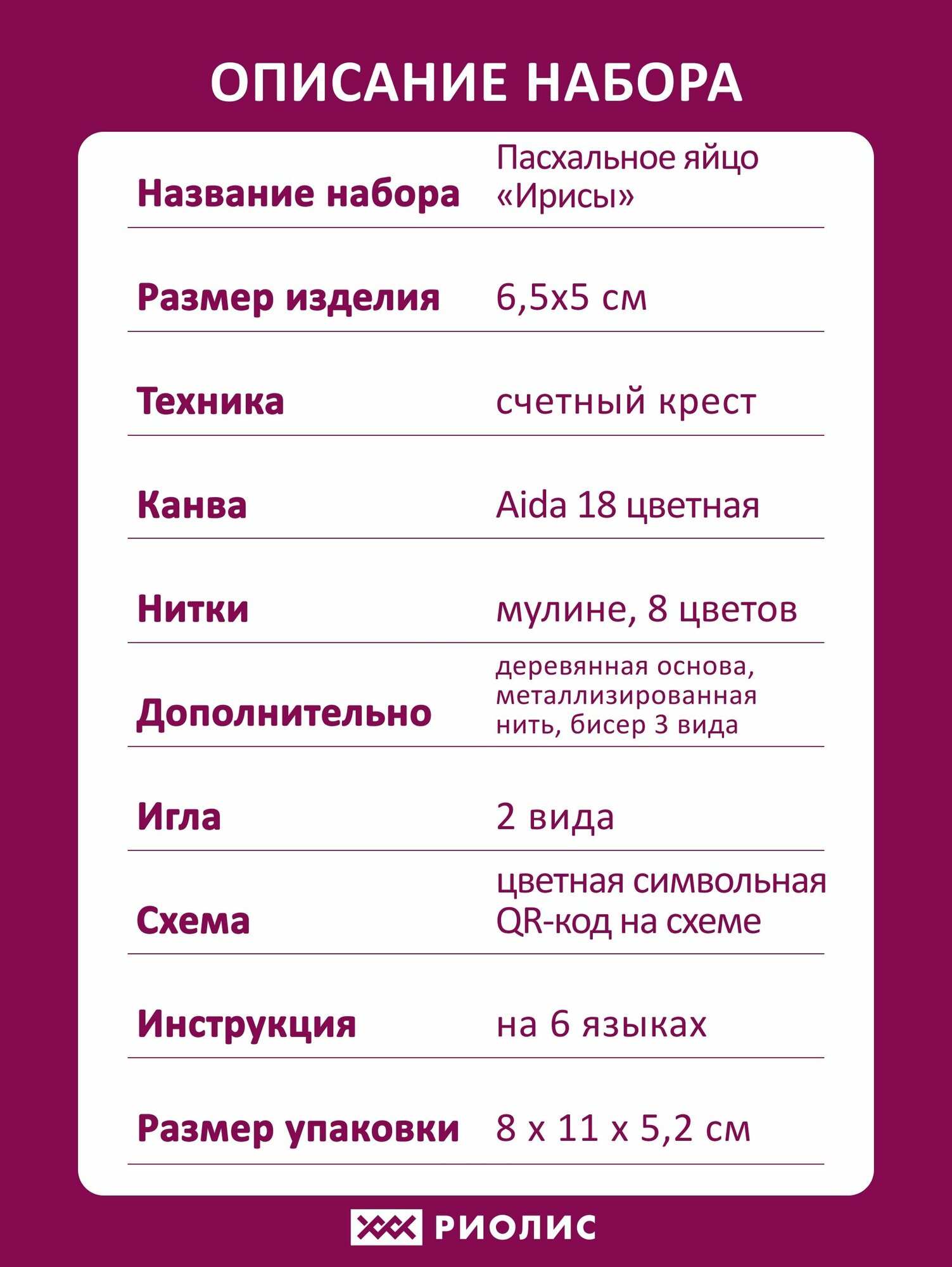 Набор для вышивания крестом Риолис, вышивка крестиком яйцо пасхальное "Ирисы" 6,5*5см, В222 интересное: