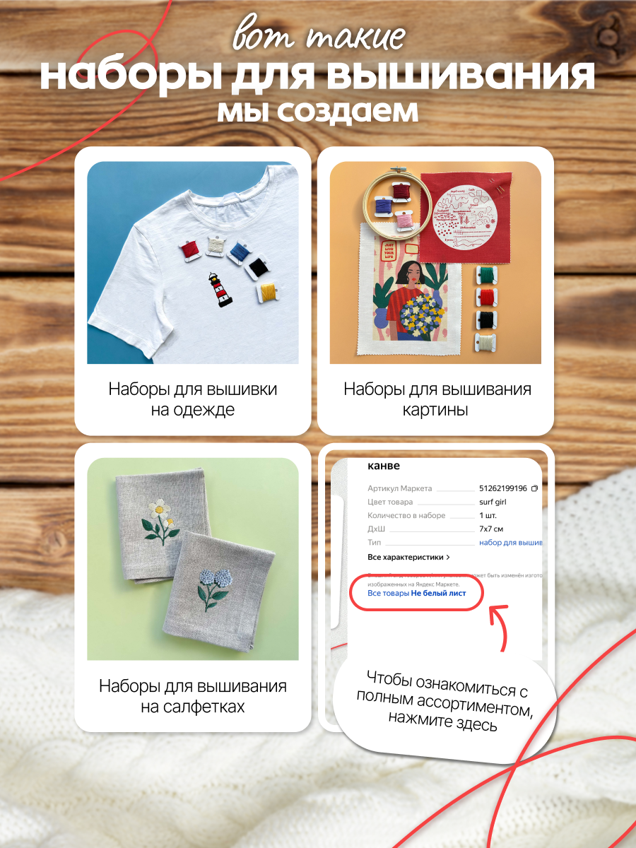 Ниже Вы можете прочитать отзывы на Набор для вышивания на одежде гладью Не белый лист "Tasty dreams" с пяльцами и обучением, ознакомится с подробными характеристиками, посмотреть интересные обзоры и фотографии на Набор для вышивания на одежде гладью Не белый лист "Tasty dreams" с пяльцами и обучением.