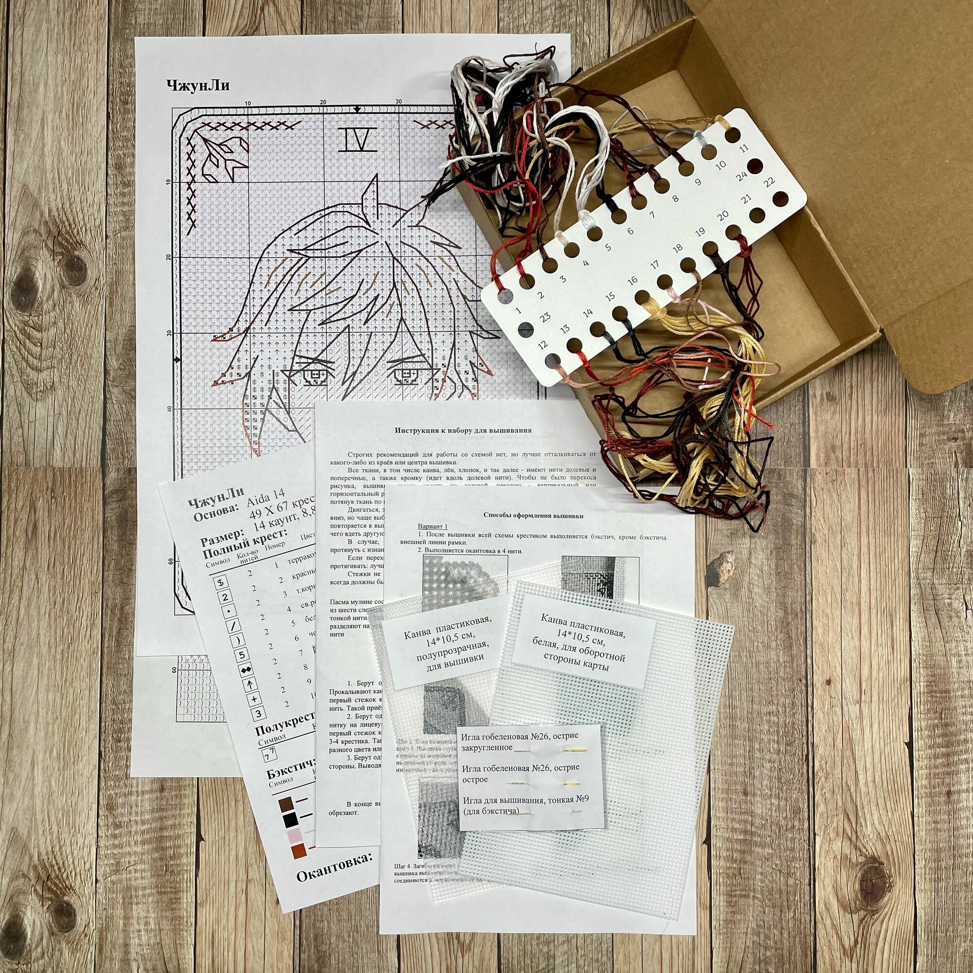 Набор для вышивания крестиком на пластике канве Чжун Ли Геншин, карта Таро Zhongli, размер 12,6х9,3 см, 14 каунт, значок