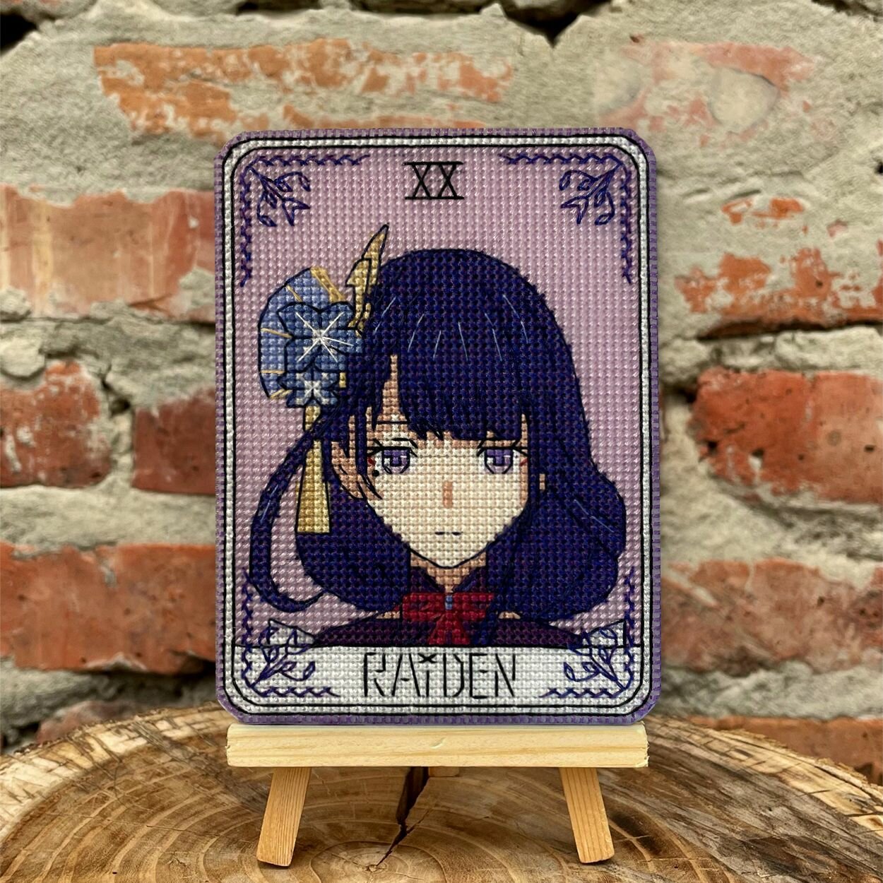 Купить Набор для вышивания крестиком на пластике Райдэн Геншин, карта Таро Raiden, размер 12,6х9,3 см, 14 каунт, значок