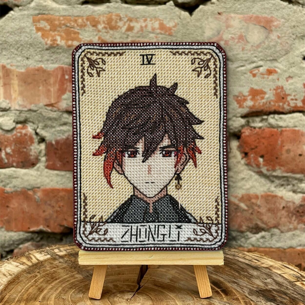 Купить Набор для вышивания крестиком на пластике канве Чжун Ли Геншин, карта Таро Zhongli, размер 12,6х9,3 см, 14 каунт, значок