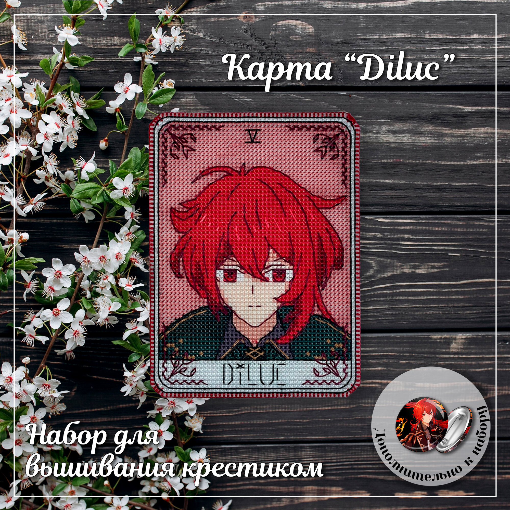 Купить Набор для вышивания крестиком на пластике Дилюк Геншин, карта Таро Diluc, размер 12,6х9,3 см, 14 каунт, значок