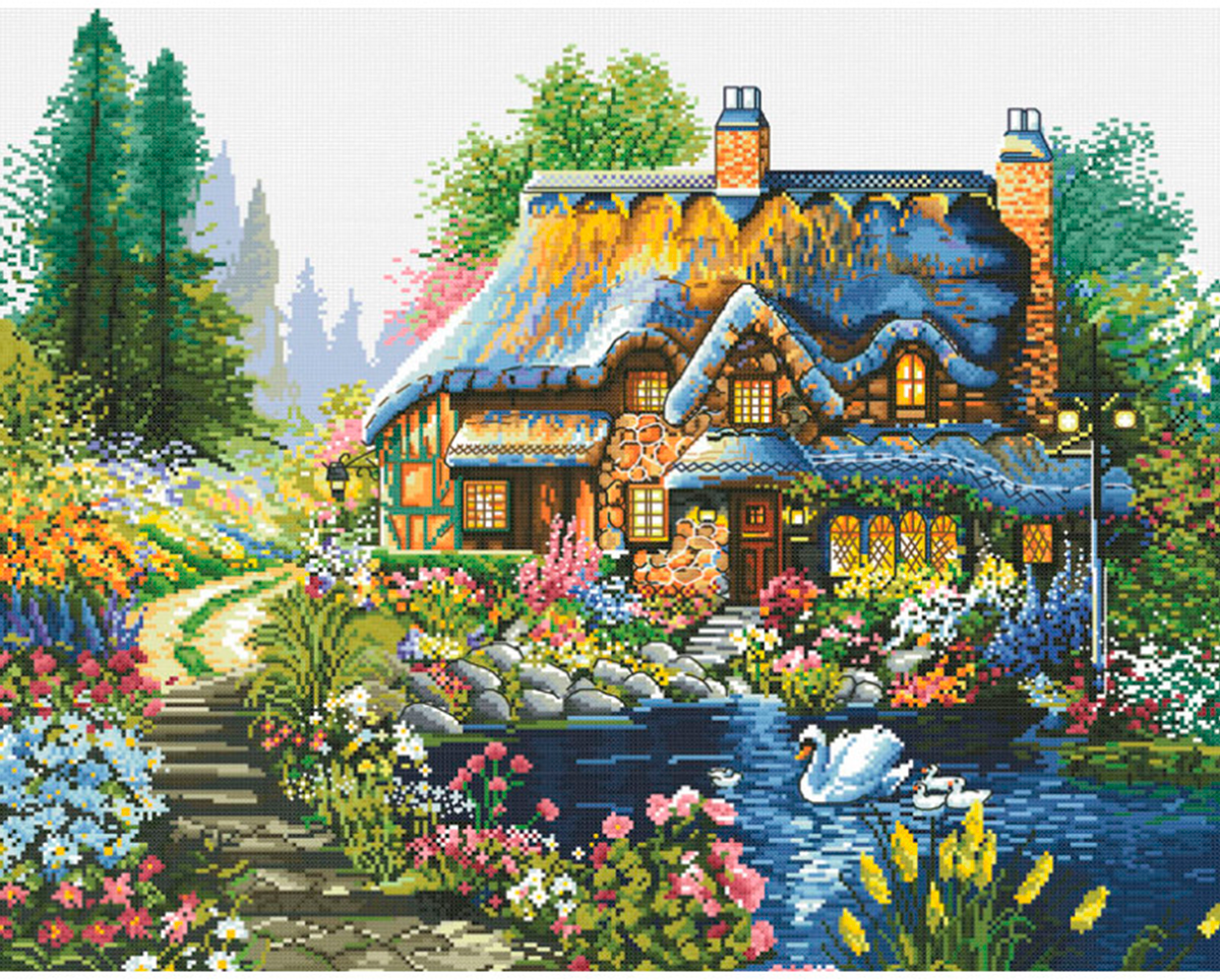 Набор для вышивания крестом Белоснежка "Домик у пруда" / Набор для вышивания 40х51 см / Дом / Цветы интересное: