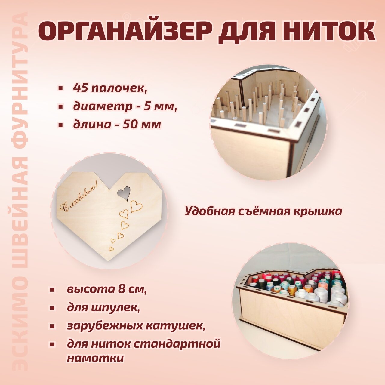 Подарочный органайзер для швейных ниток, 45 штырей, НитьДом Сердце "С любовью" интересное: