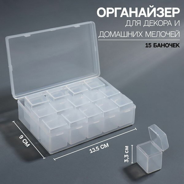 Купить Органайзер для хранения мелочей, 15 баночек, 9 мл, 13.5x8.5x4 см, прозрачный