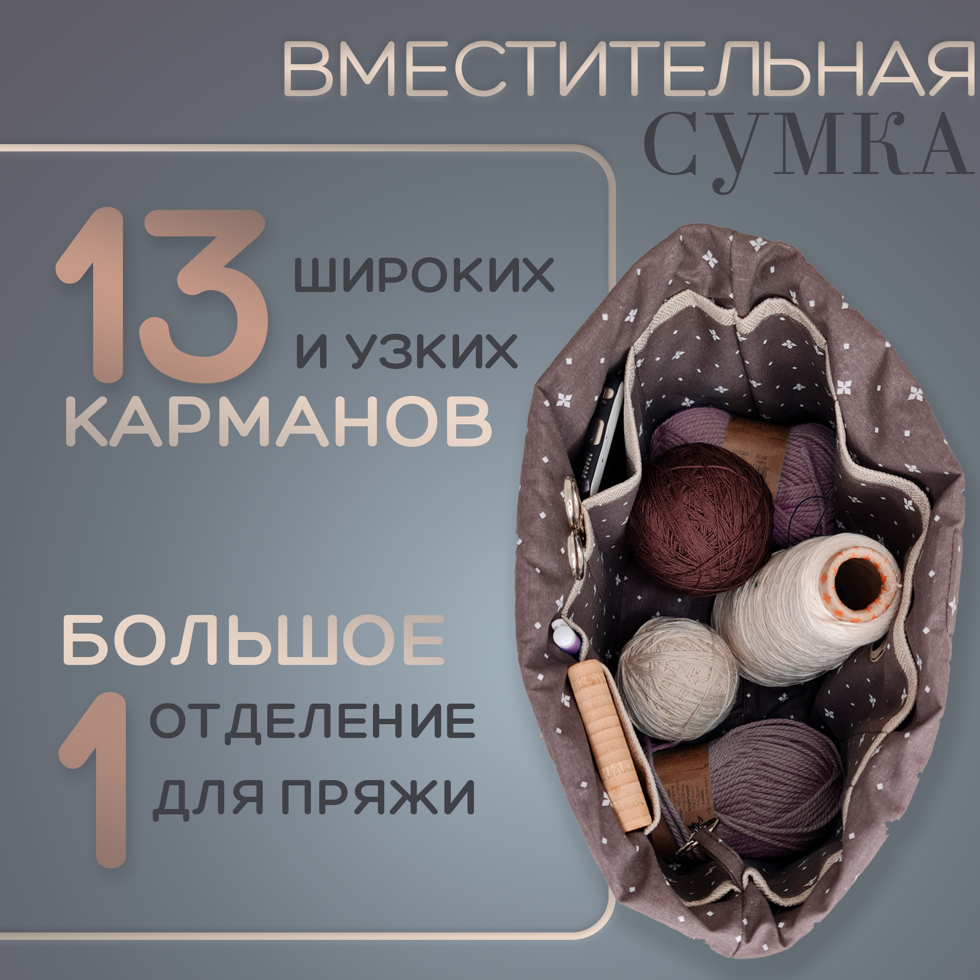 Набор: проектная сумка для вязания (41хh28,5, дно14,5 x 27), органайзер для спиц и крючков, клубочница (14.5х 4.5х h17)