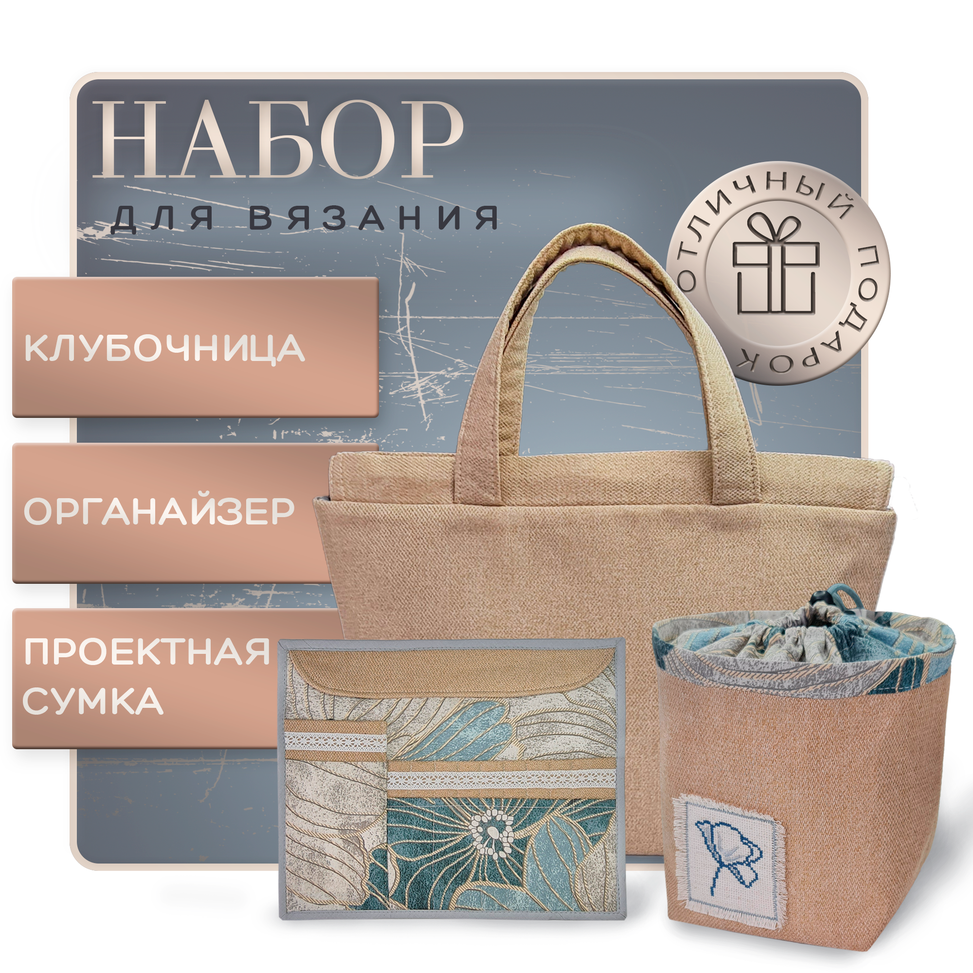Набор: проектная сумка для вязания (41хh28,5, дно14,5x27 см), органайзер для спиц и крючков, клубочница (14.5х14.5хh17)