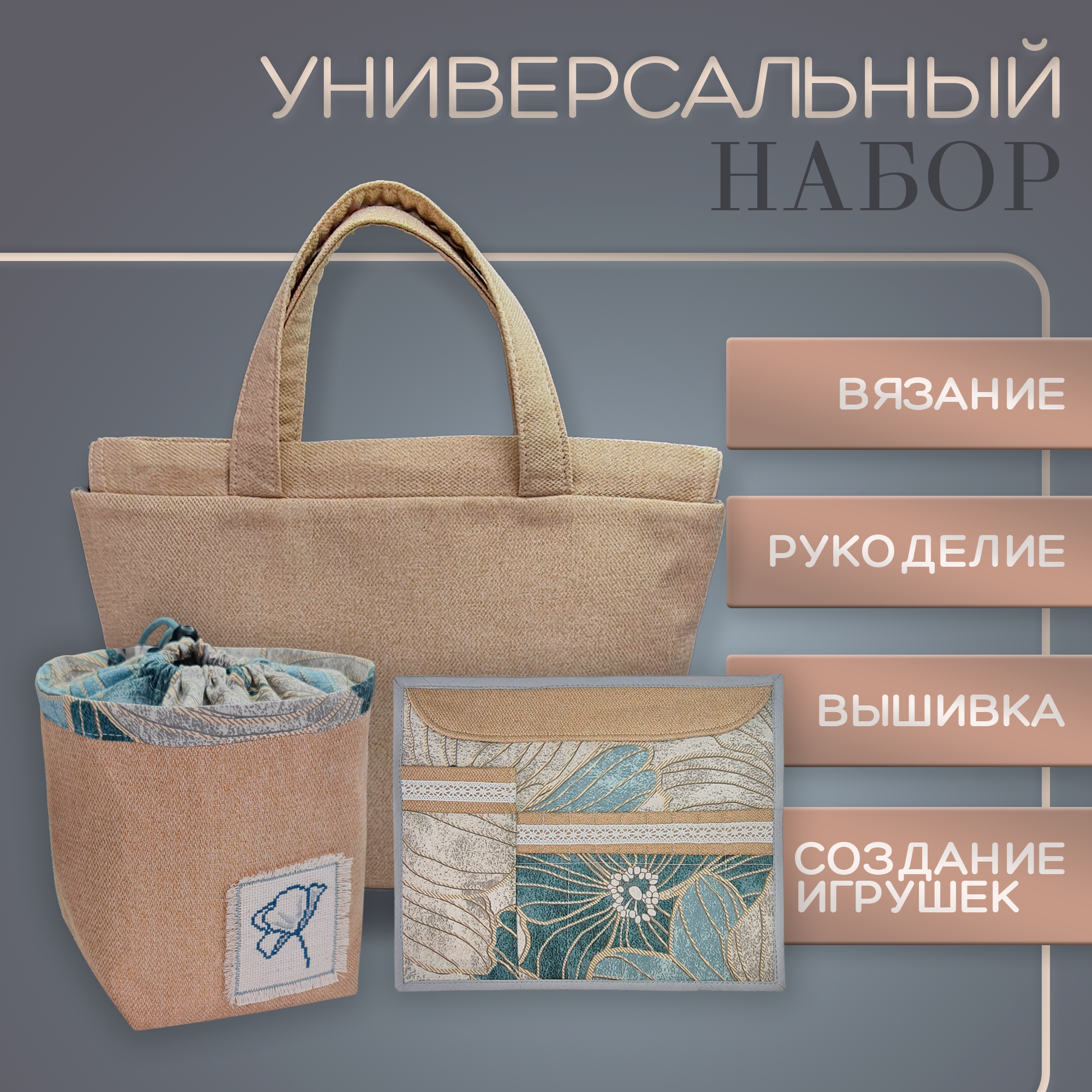 Сумка для вязания, клубочница, органайзер для рукоделия , набор 3 предмета, серый