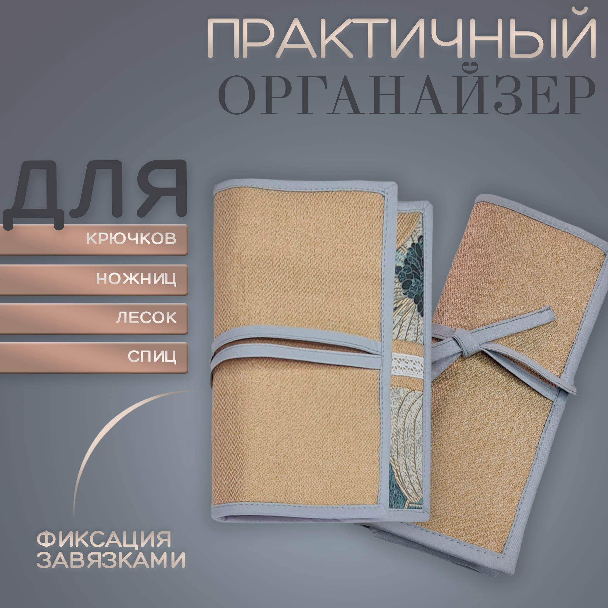 Набор: проектная сумка для вязания (41 х h28,5, дно14,5 x 27 см), органайзер для спиц и крючков (24 см х 29 см) бежевый