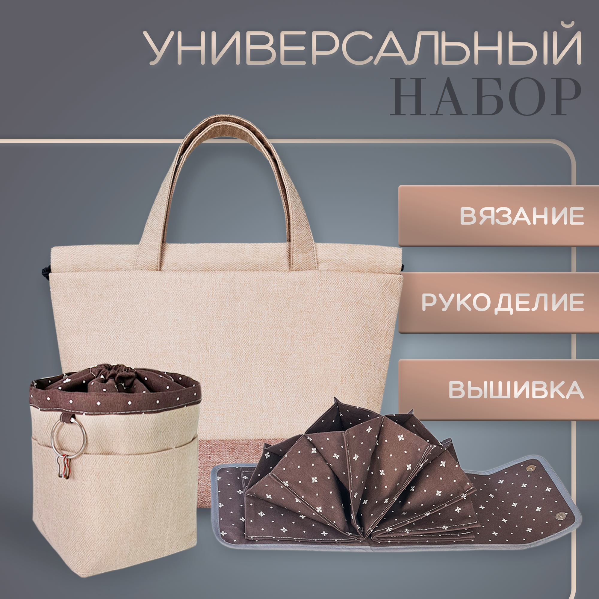 Набор: проектная сумка для вязания (41 х h28,5, дно14,5 x 27 см), органайзер для спиц и крючков (24 см х 29 см) бежевый