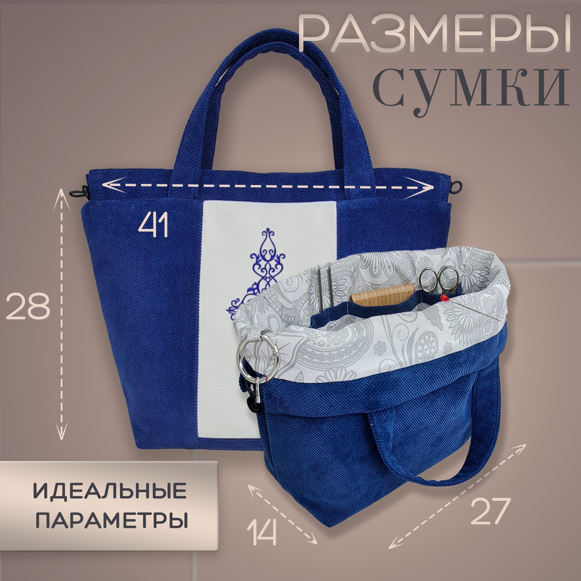 Набор: проектная сумка для вязания (41 х h28,5, дно14,5 x 27 см), органайзер для спиц и крючков (24 см х 29 см) синий