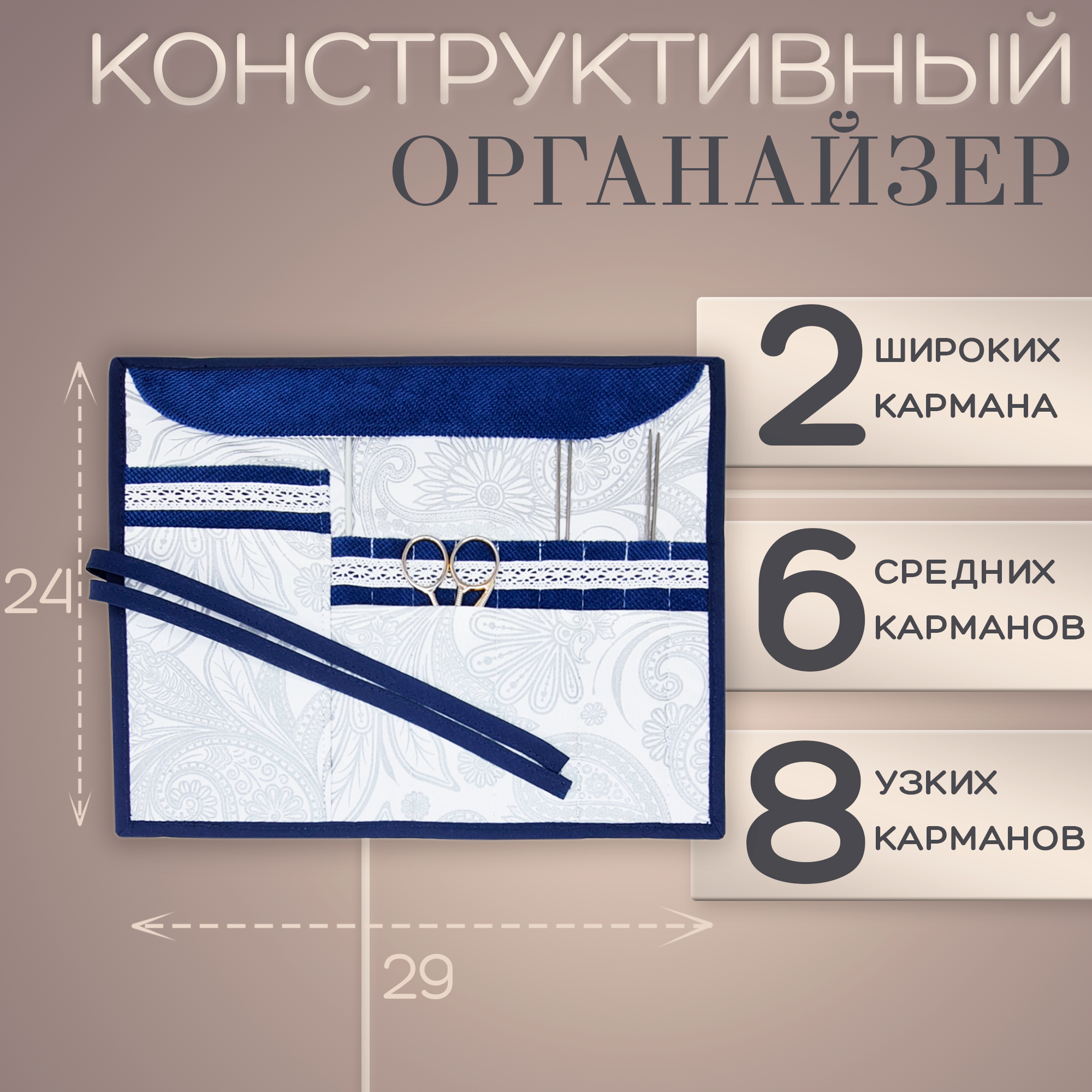 Набор: проектная сумка для вязания (41 х h28,5, дно14,5 x 27 см), органайзер для спиц и крючков (24 см х 29 см) бежевый