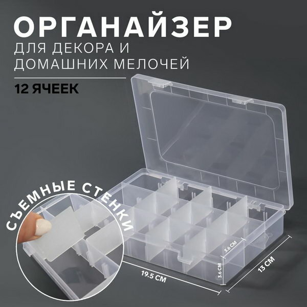 Органайзер для хранения мелочей, передвижные перегородки, 12 секций, 19.5x13x3.6 см, прозрачный интересное: