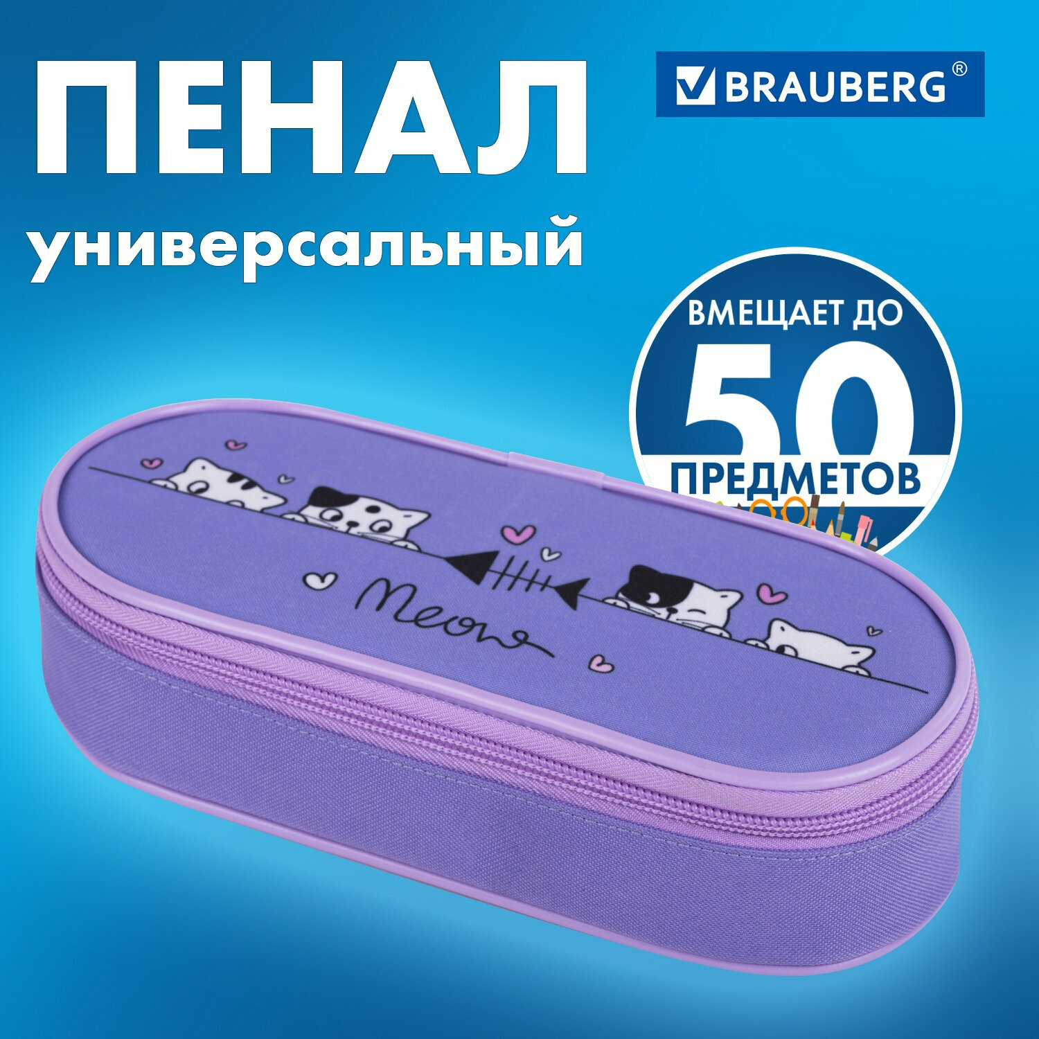 Пенал-футляр Brauberg, 1 отделение, органайзер, полиэстер, 22x9х5 см, Meow, 272312 интересное: