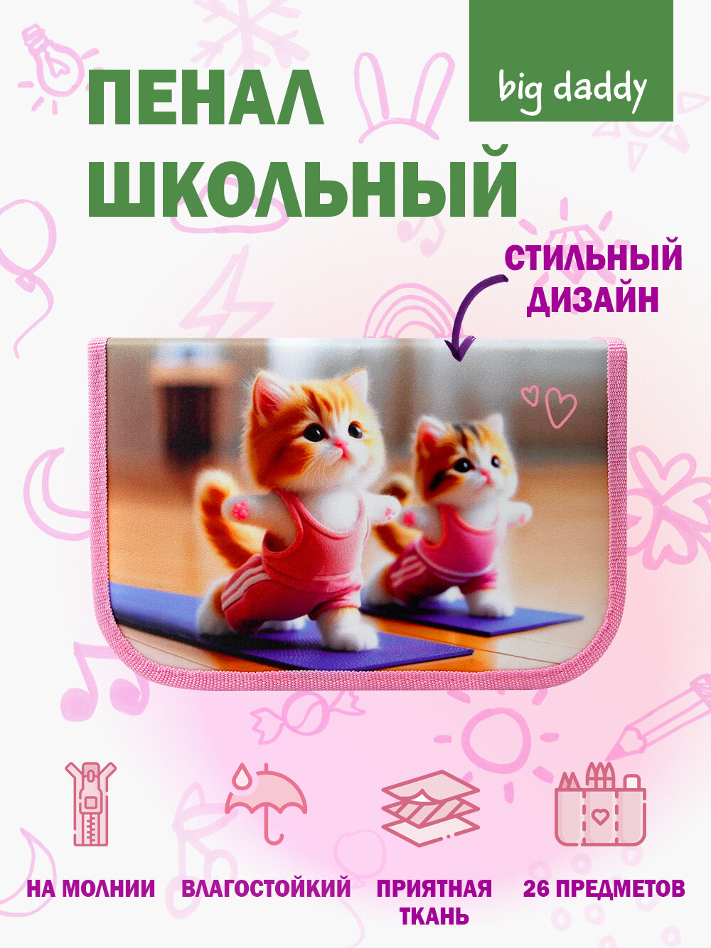 СохранитьПенал школьный bigdaddy 1 отделение 2 откидные секции 130*210*35мм "Котята на спорте" интересное: