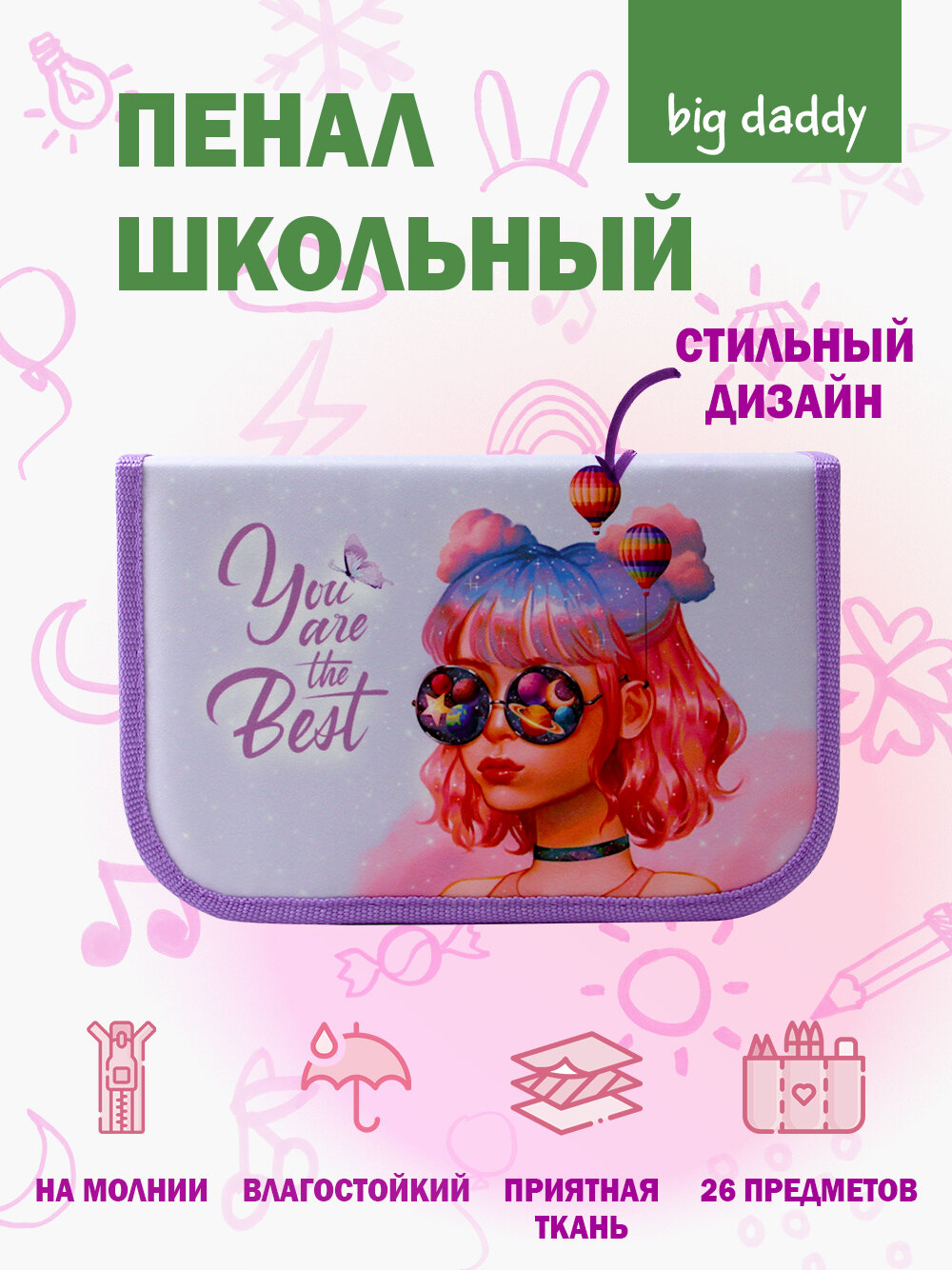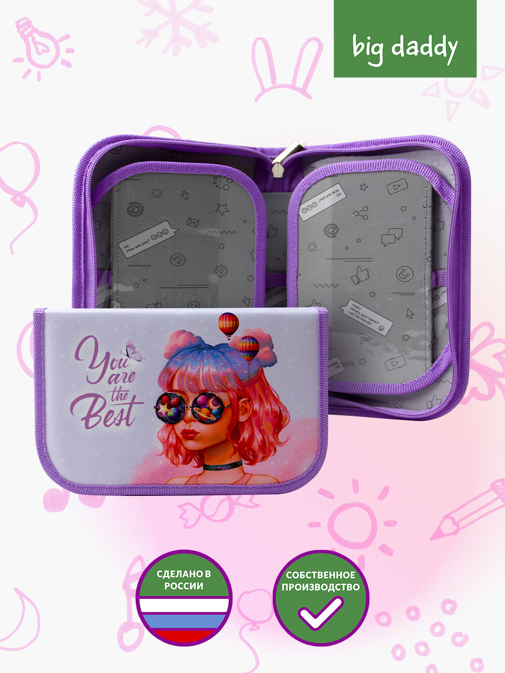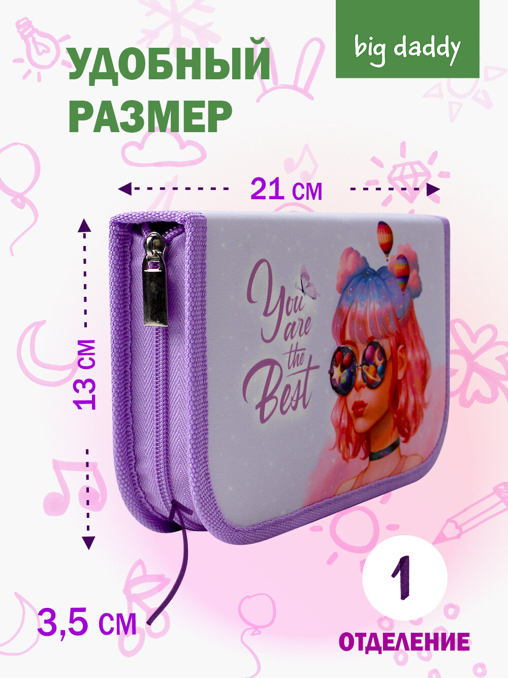 Пенал школьный bigdaddy 1 отделение 2 откидные секции 130*210*35мм "Ты - лучшая"