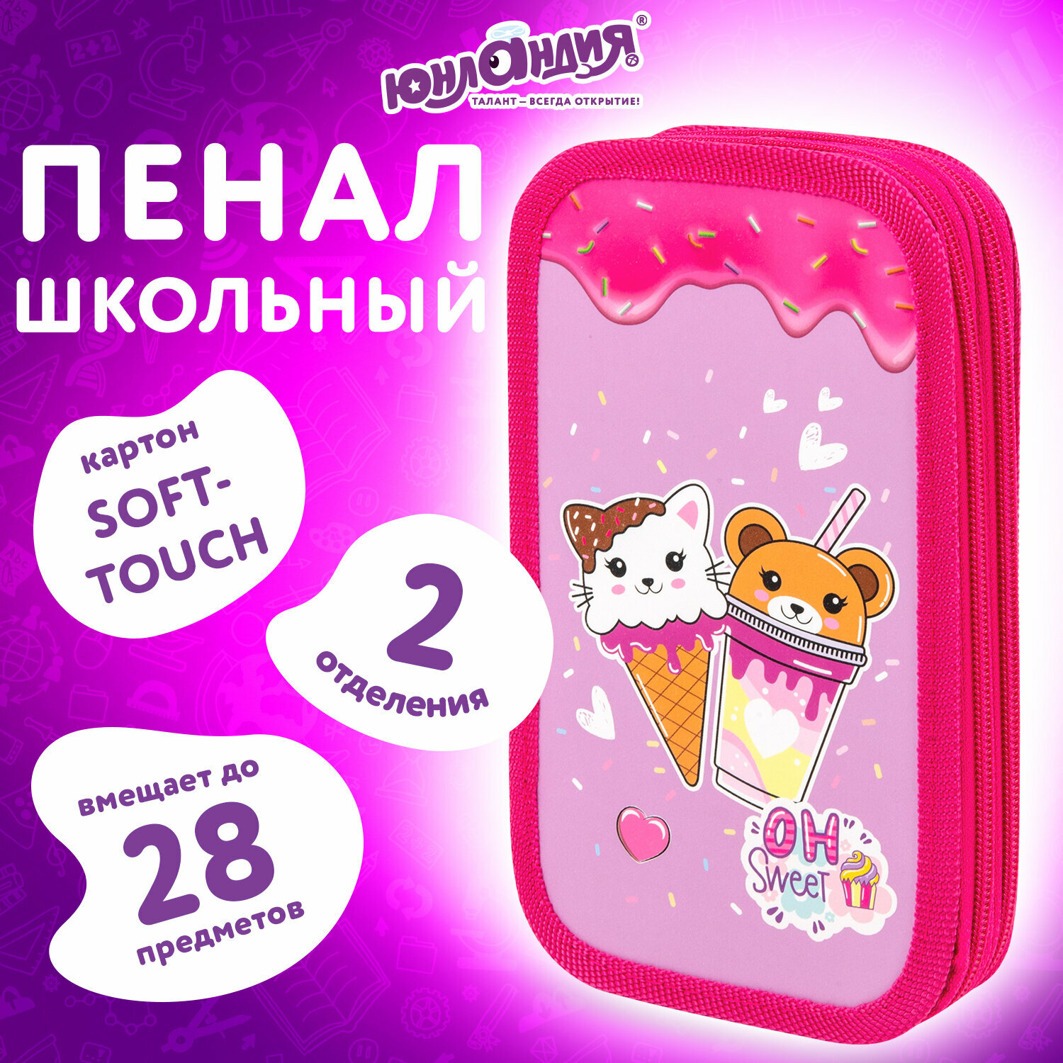 Купить Пенал Юнландия, 2 отделения, картон с эффектом soft-touch, 19х11 см, Candy friends, 272263