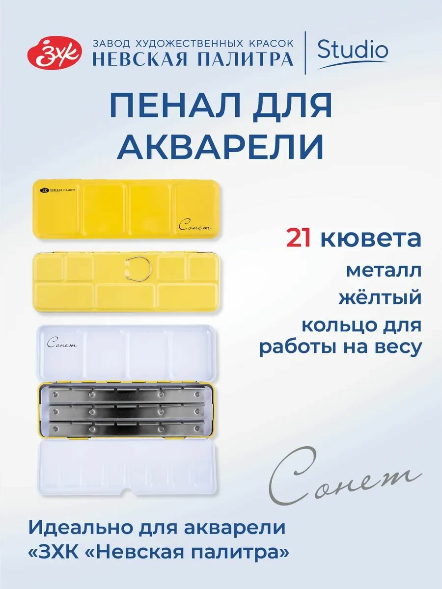 Пенал для акварели металлический на 21 кювету с палитрой Невская палитра Сонет, жёлтый 1751301320 интересное: