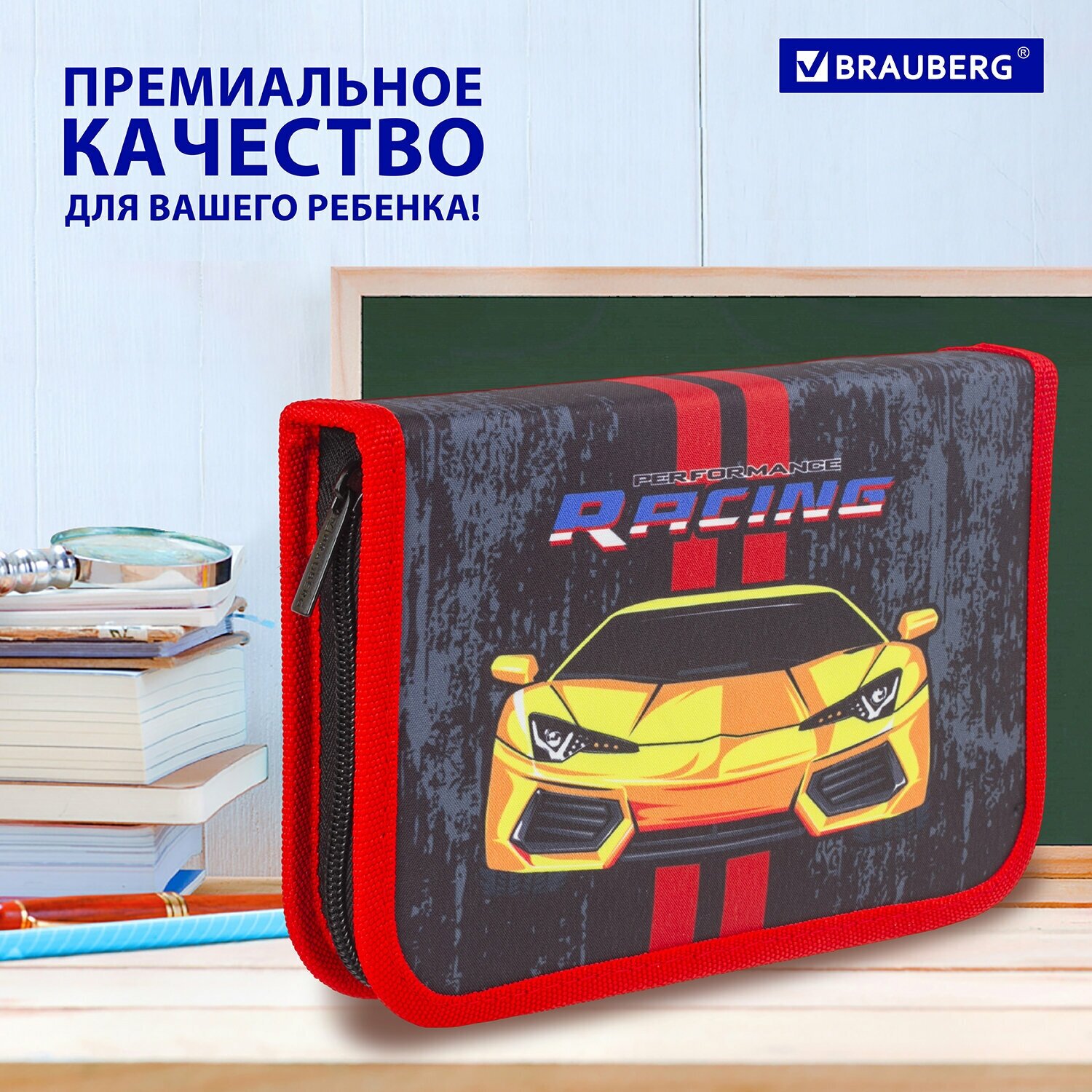 Пенал BRAUBERG с наполнением, 1 отд, откидная планка, 24 предмета, 21х14 см, Yellow car, 229292 интересное: