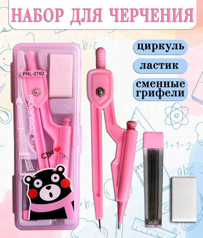 Циркуль школьный "Мишка" TH42-32, цвет розовый / Набор для черчения: циркуль, ластик, сменные грифели интересное: