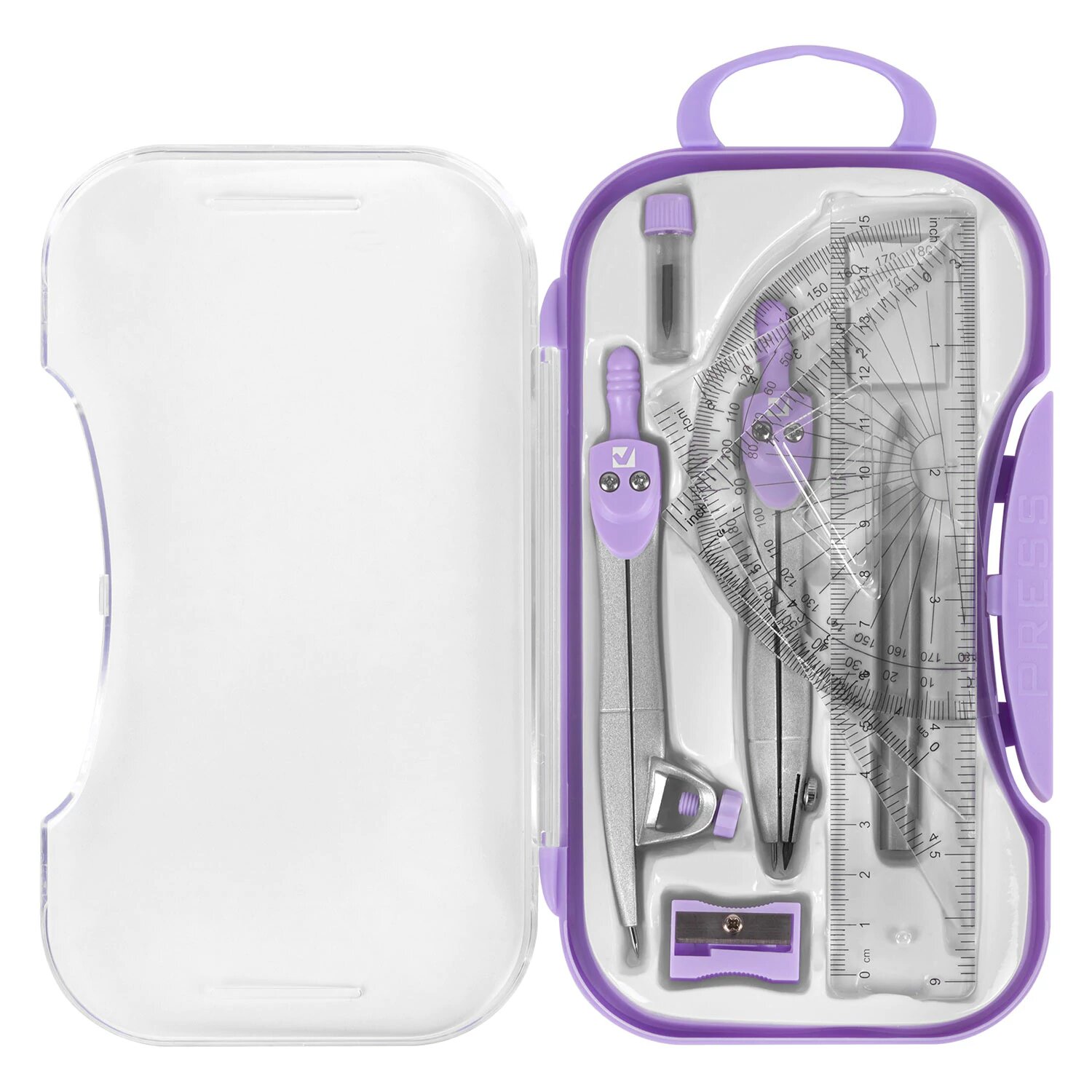 Купить Готовальня с циркулем школьная 115 мм, набор 11 предметов для черчения, чертежные принадлежности в пластиковом пенале, цвет лаванда, Brauberg, 881091