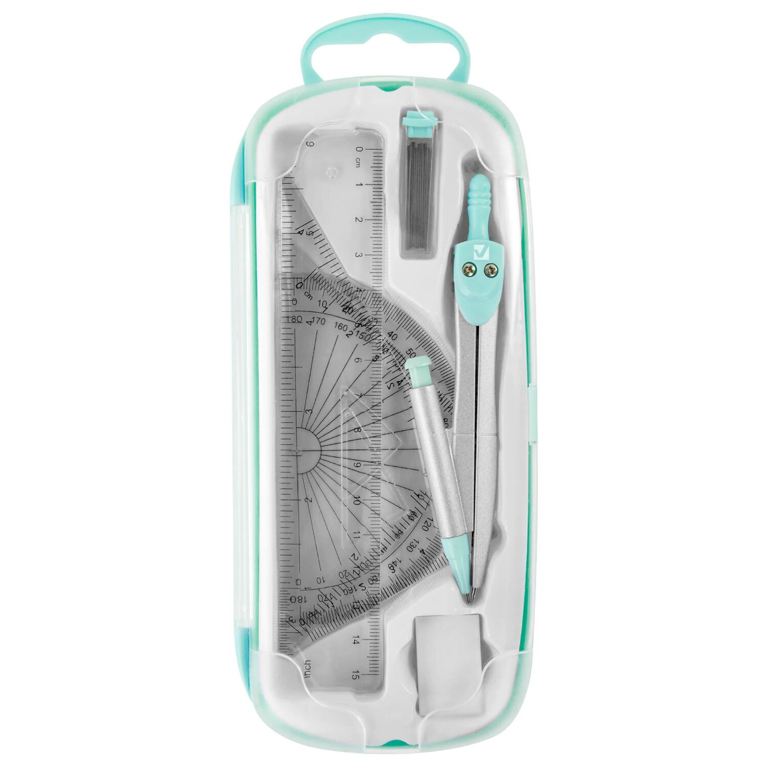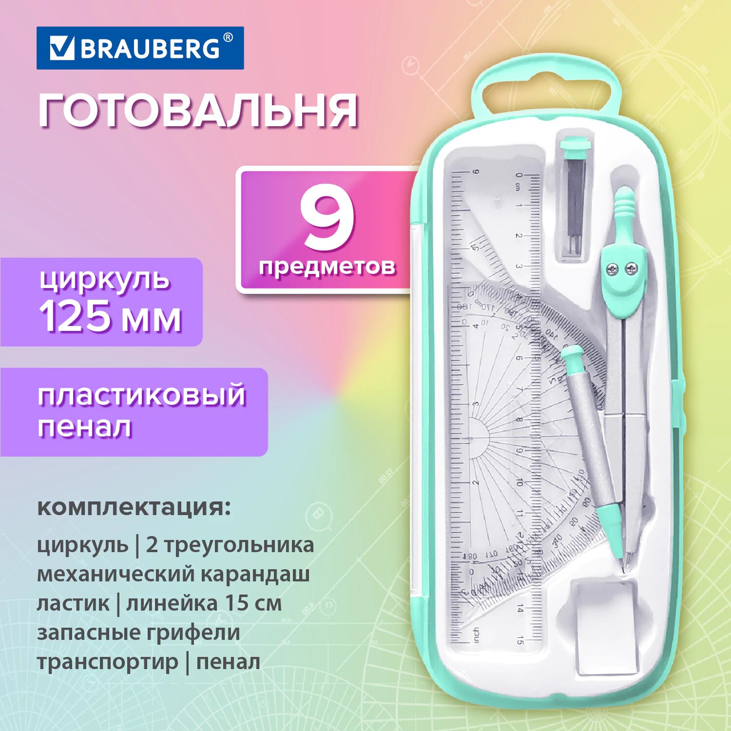 Купить Готовальня с циркулем школьная 125 мм, набор 9 предметов для черчения, чертежные принадлежности в пластиковом пенале, цвет мятный, Brauberg, 210716