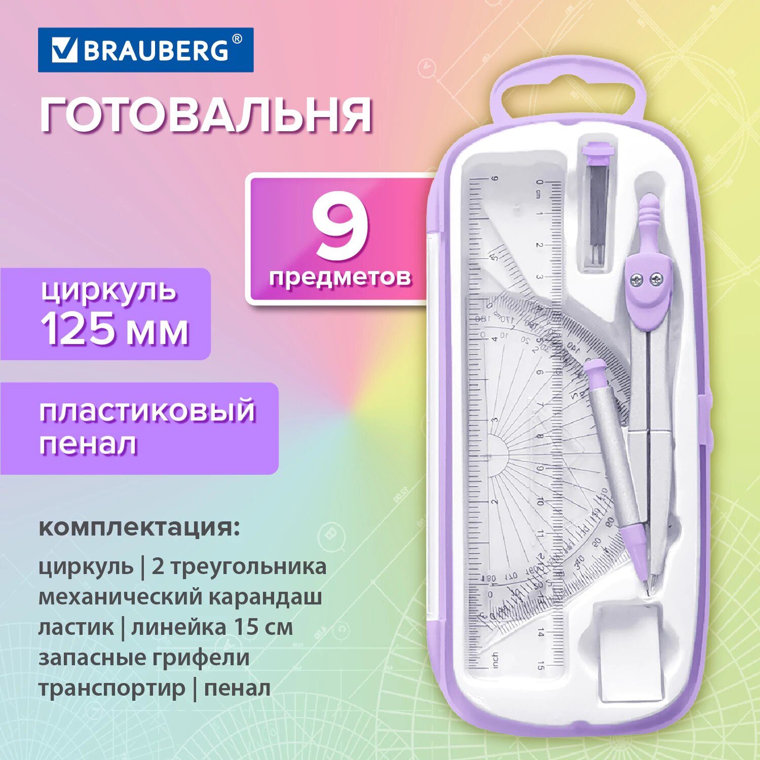 СохранитьГотовальня с циркулем школьная 125 мм, набор 9 предметов для черчения, чертежные принадлежности в пластиковом пенале, цвет лаванда, Brauberg, 210713 интересное: