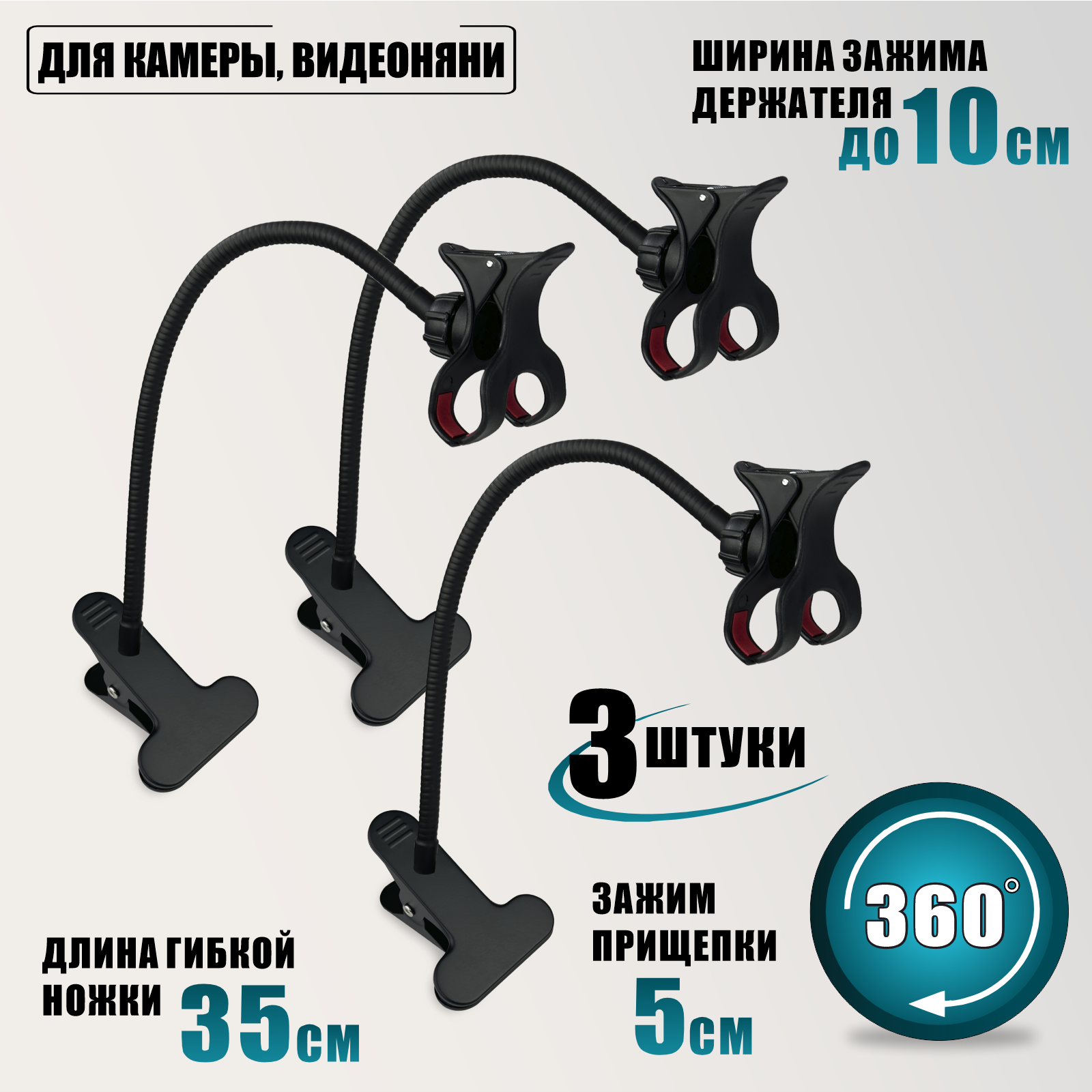 Купить Крепление для камеры, видеоняни, на гибком креплении 35 см и прищепке, цвет черный, 3 шт