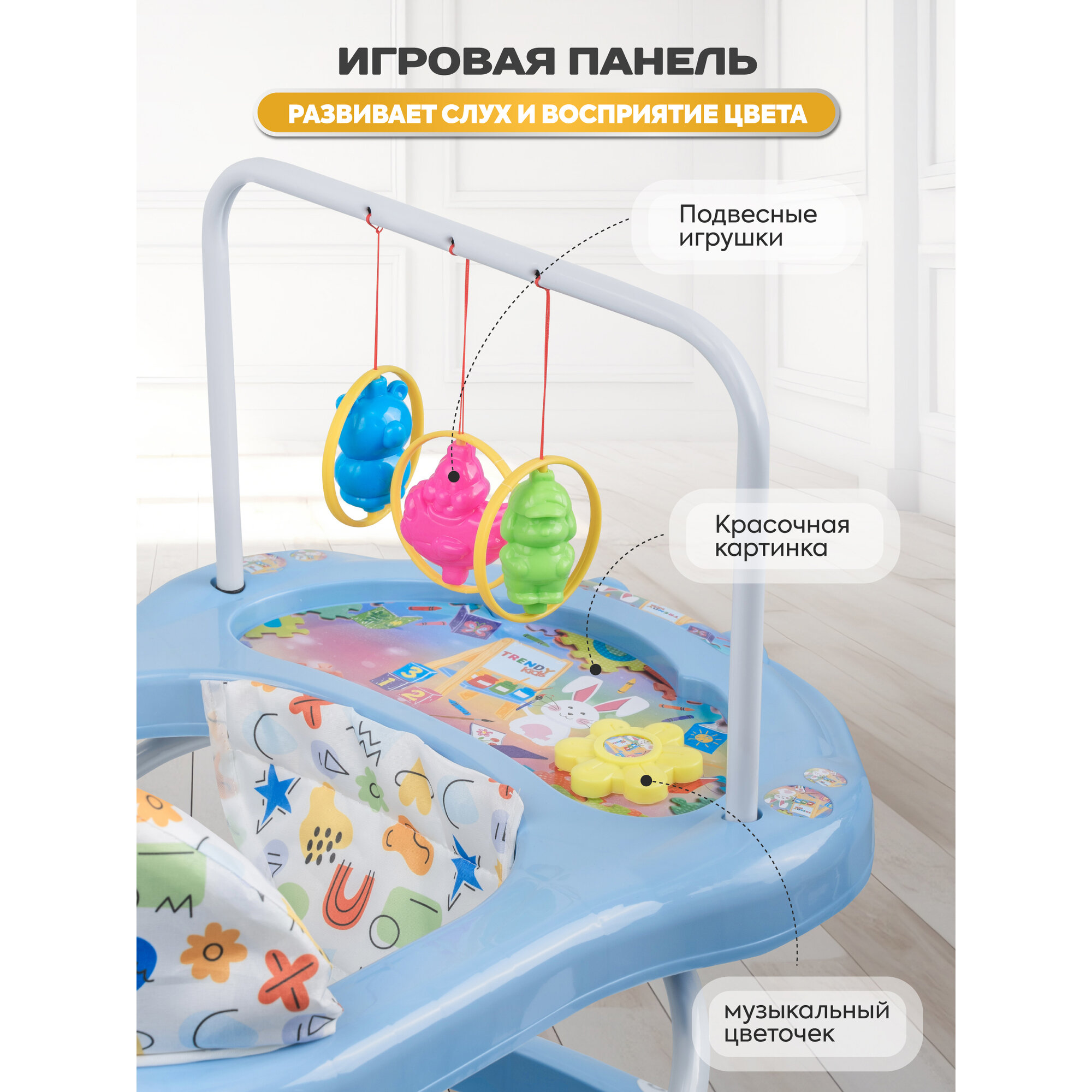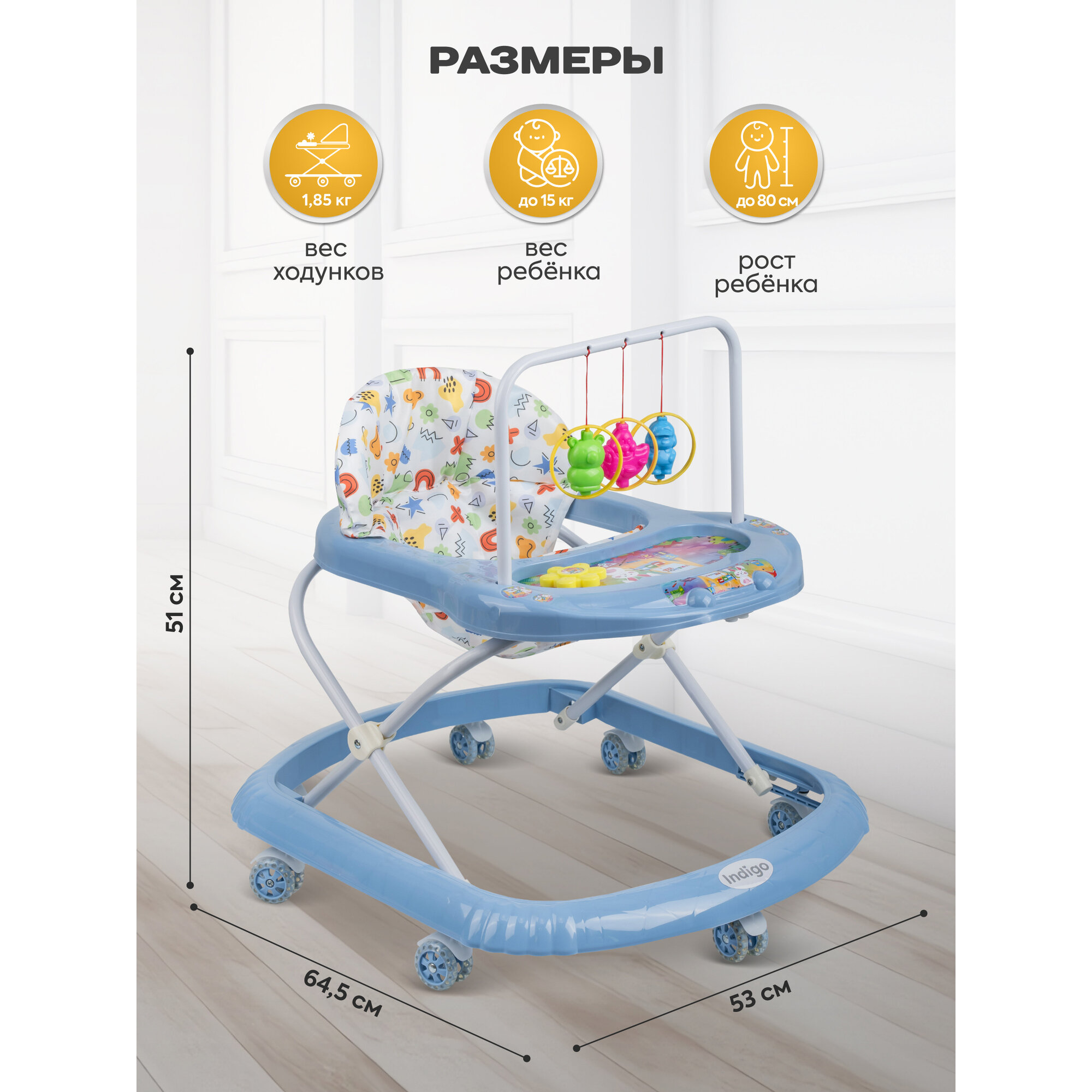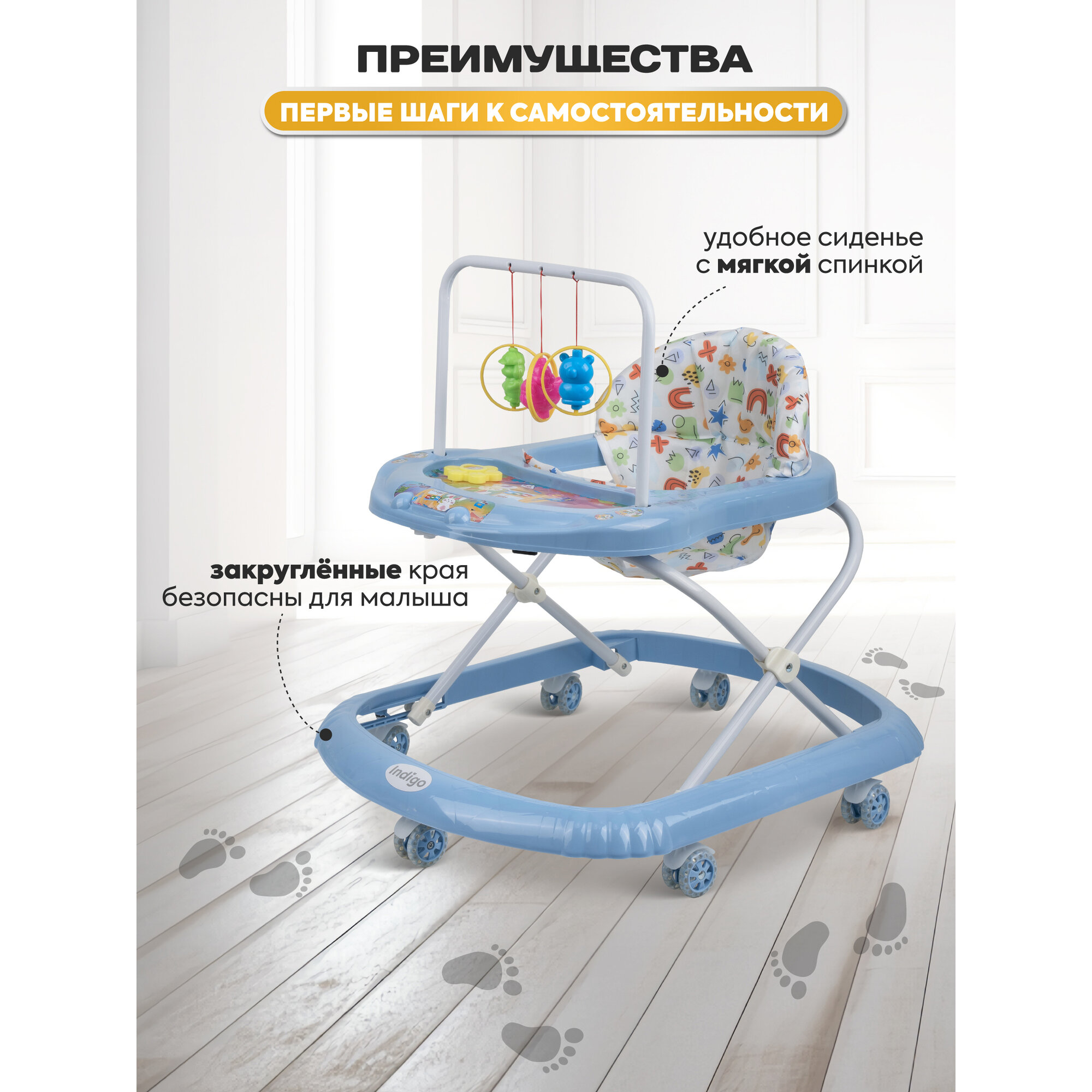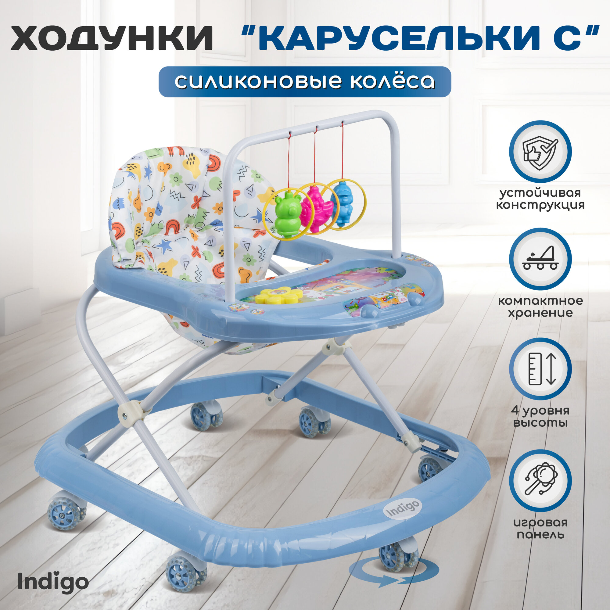Ходунки детские музыкальные Indigo Карусельки C со съемной игровой панелью, 7 силиконовых колес, синий интересное: