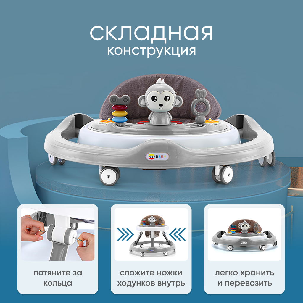 Ходунки детские для мальчиков и девочек с игровой панелью складные, музыкальная каталка для малышей, серые интересное: