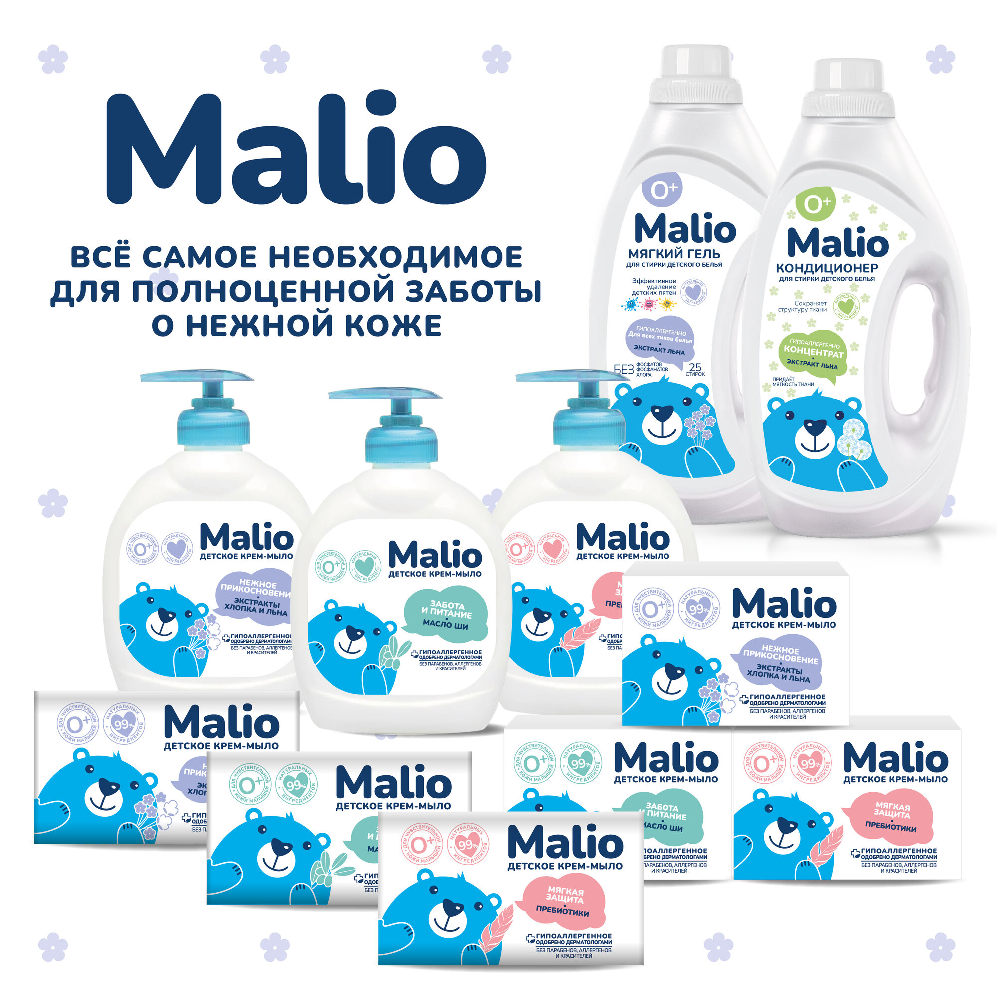Мыло туалетное твердое Малио, детское крем -мыло с экстрактом хлопка и льна, 0+, 90 гр, 6 шт