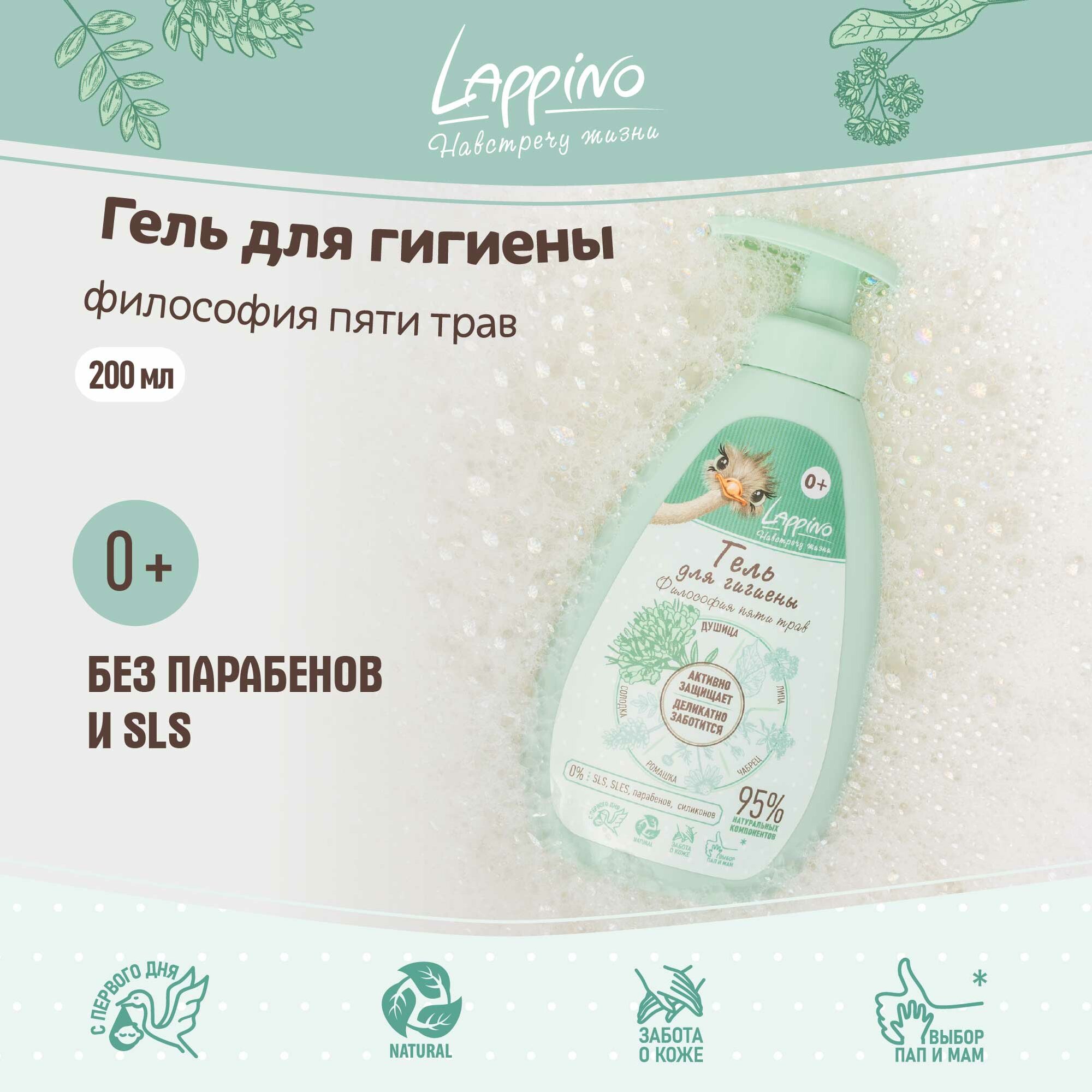 Гель для подмывания младенцев Lappino "Философия пяти трав", гипоаллергенный, травяной аромат, 200мл интересное: