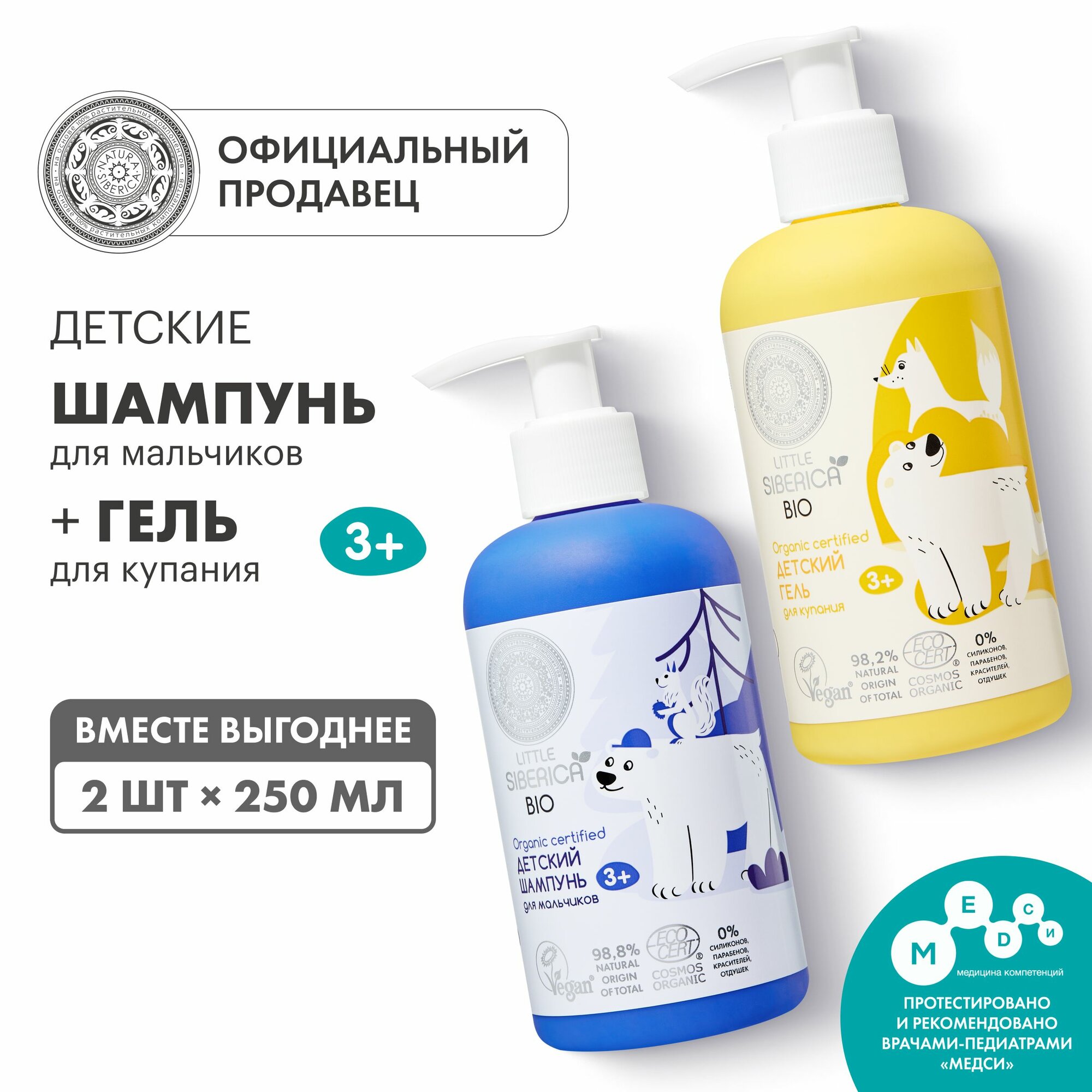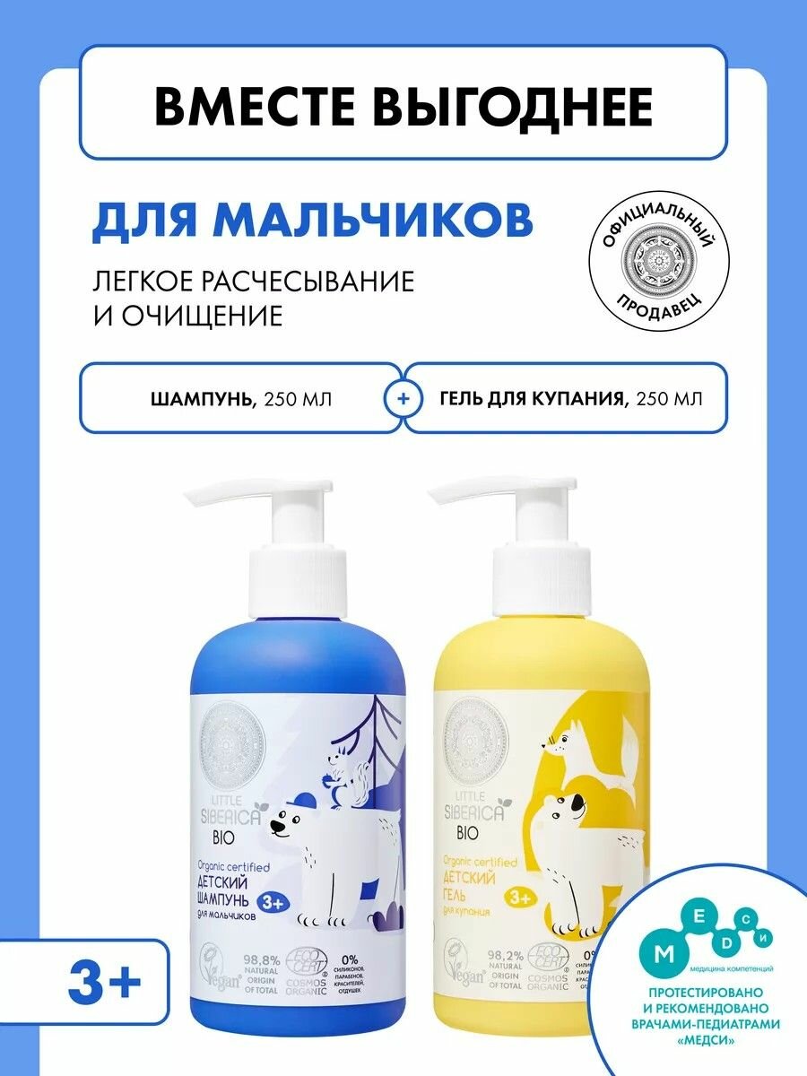Купить Natura Siberica Little Детский набор для купания мальчиков 3+: шампунь для волос, гель для душа 2 шт х 250 мл