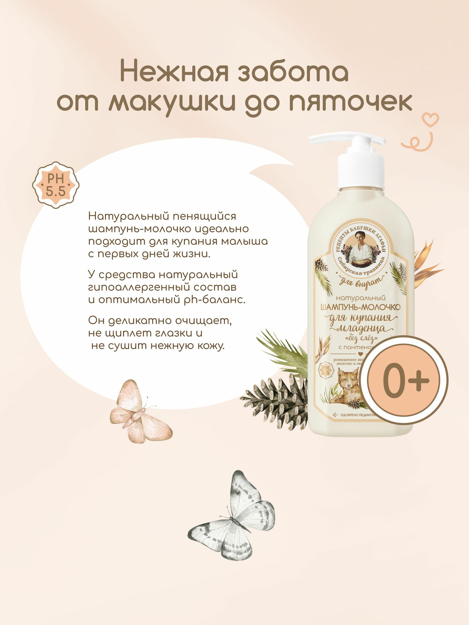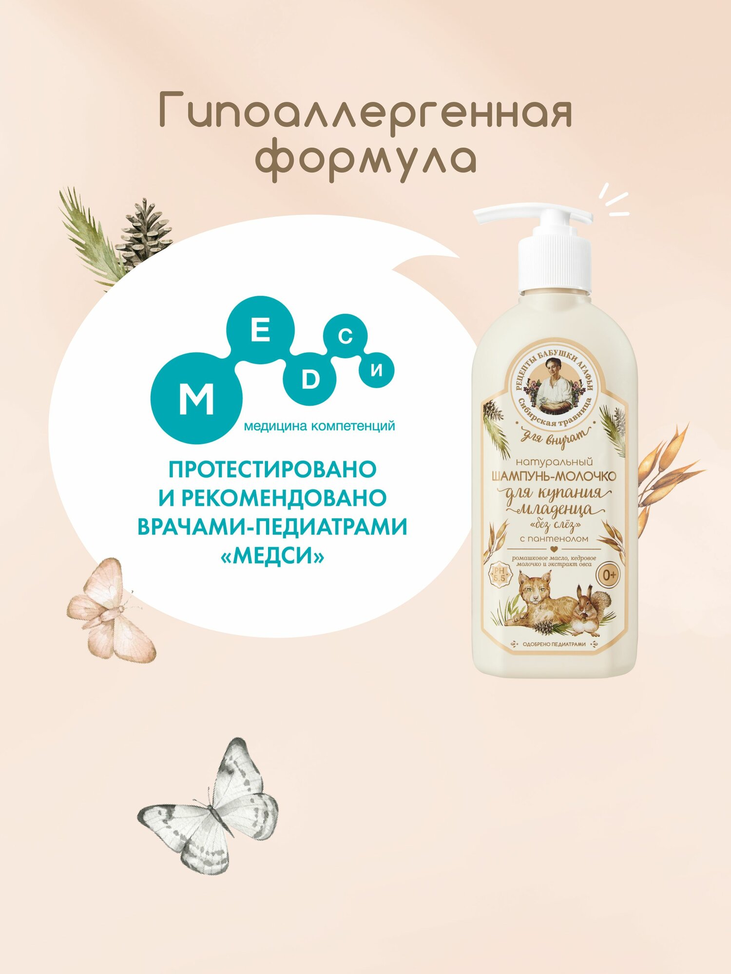 Рецепты бабушки Агафьи для внучат Шампунь молочко без слез для волос и купания младенца 2 в 1 бессульфатный с пантенолом 0+, 350 мл интересное: