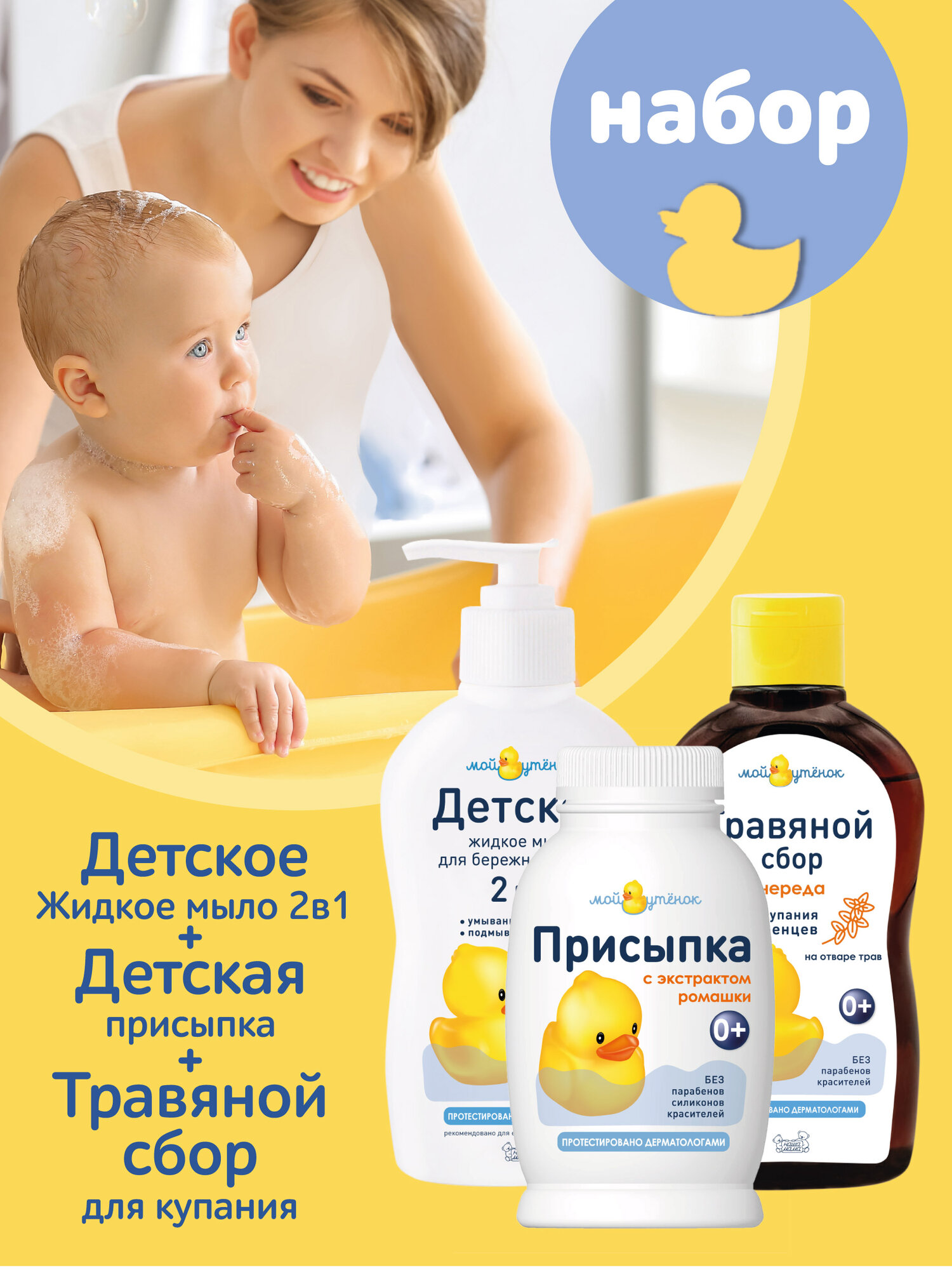 Купить Мой Утенок Набор Присыпка 50гр; Жидкое мыло 2в1 250мл; Экстракт для купания Череда 250мл, гипоаллергенно, с рождения