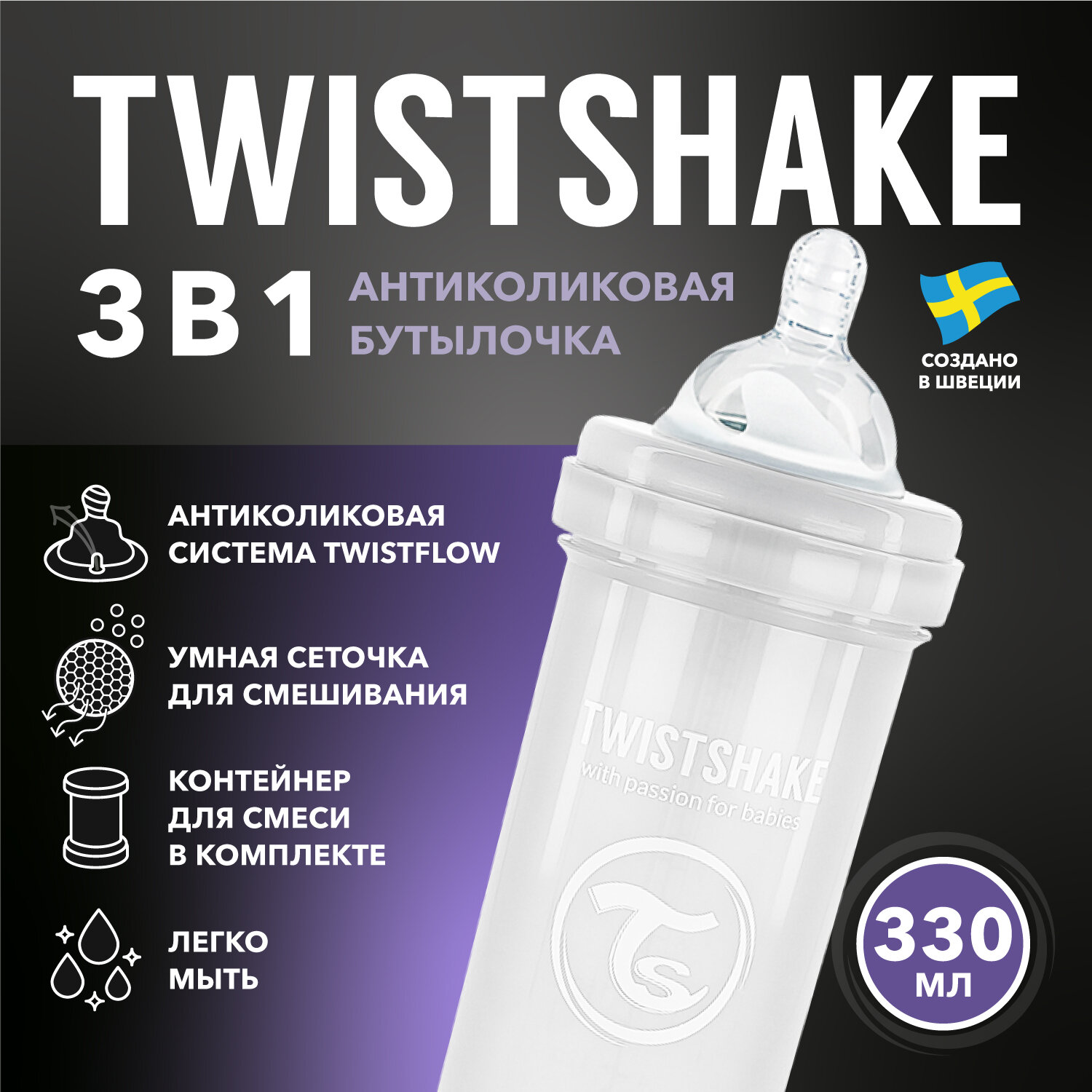 Детская антиколиковая бутылочка для кормления Twistshake, 330 мл, от 4 мес. Белый Бриллиант интересное:
