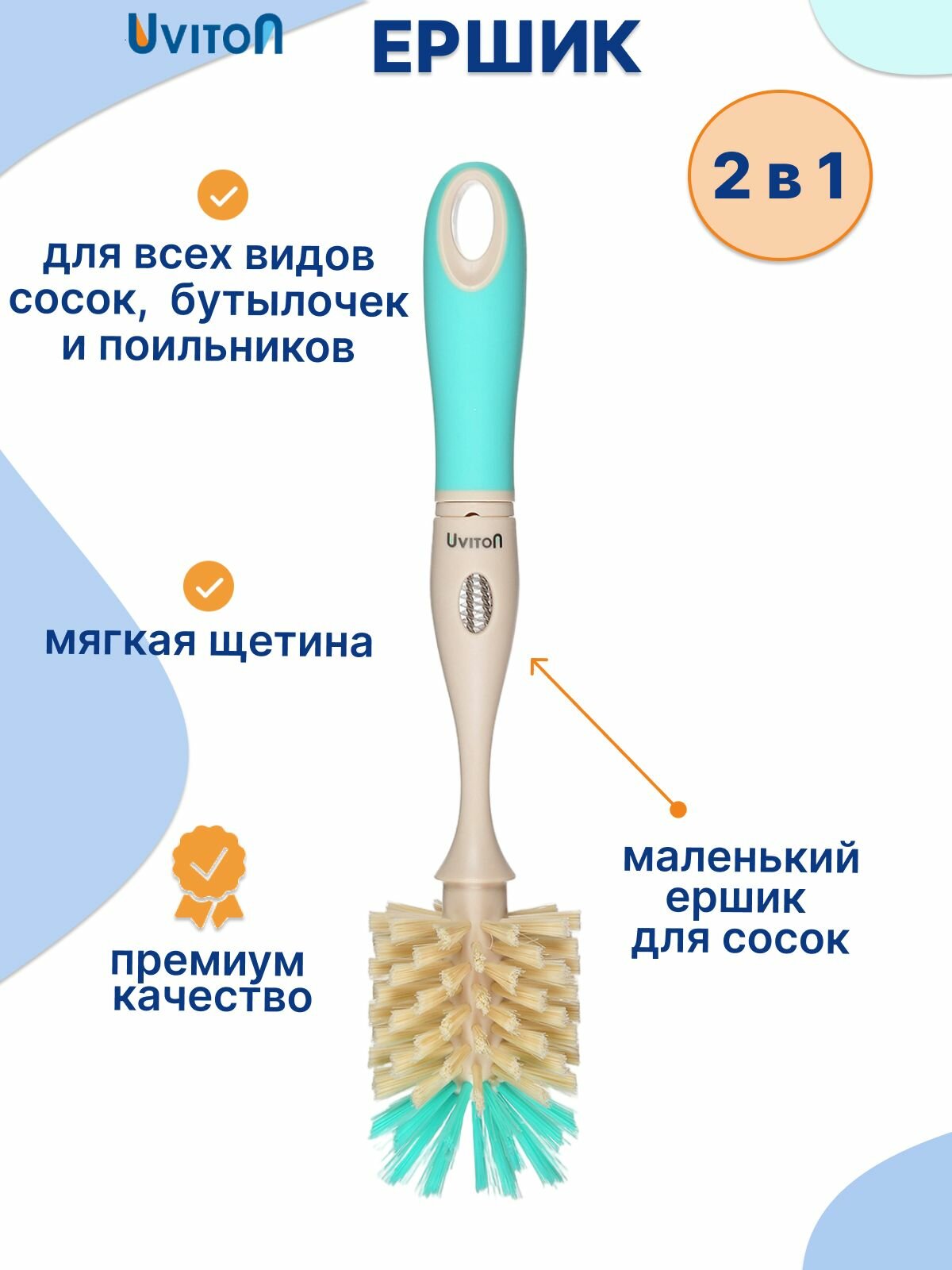 Ершик с мягкой щетиной для бутылочек и сосок от бренда Uviton 2 в 1 интересное:
