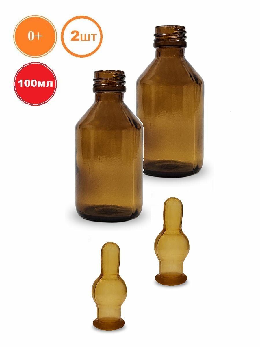 Купить Бутылочка стеклянная 100 мл. с соской латекс детская узкое горло, набор 2 шт.
