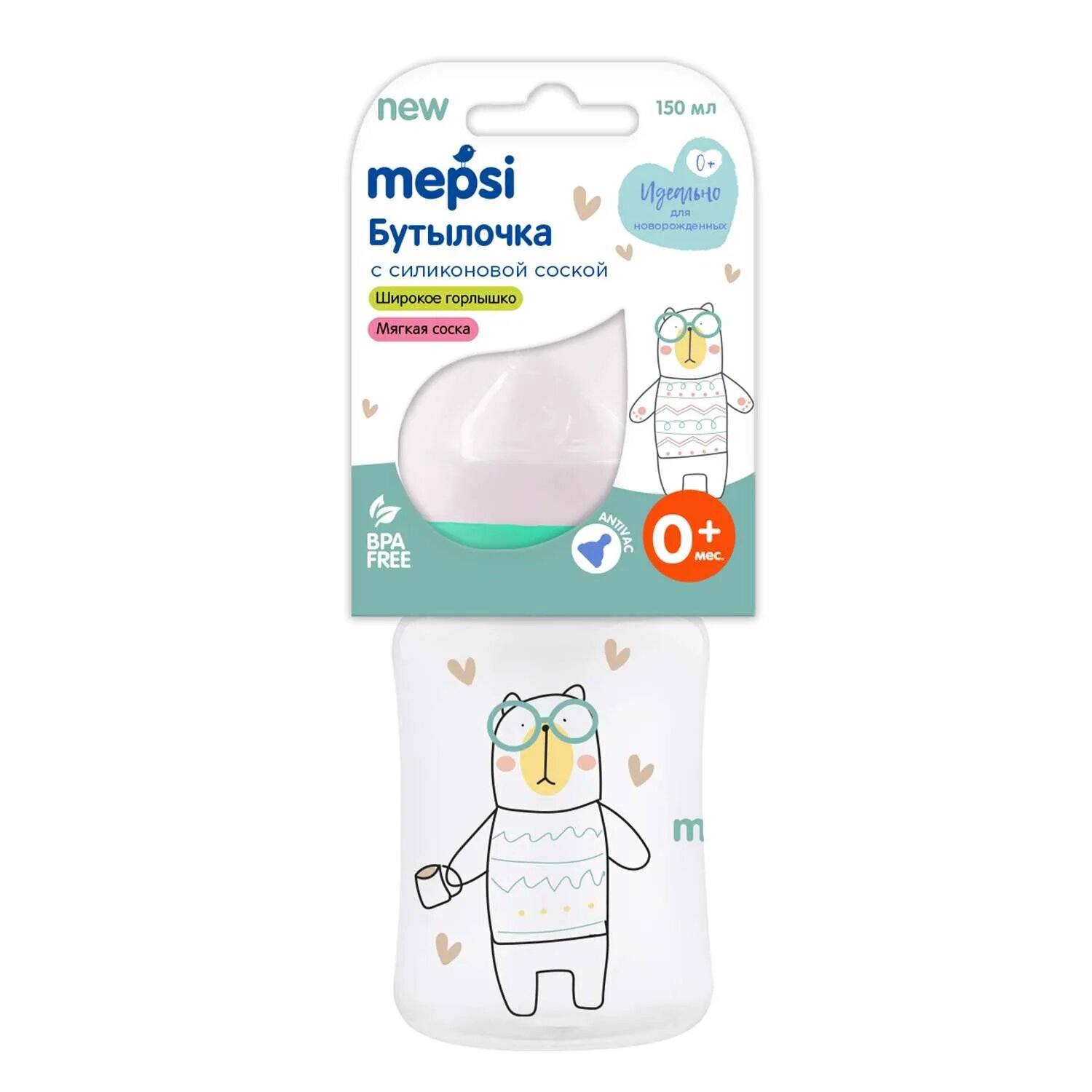 Mepsi Бутылочка из ПП Bunny с широким горлом и силиконовой соской 150мл 0+