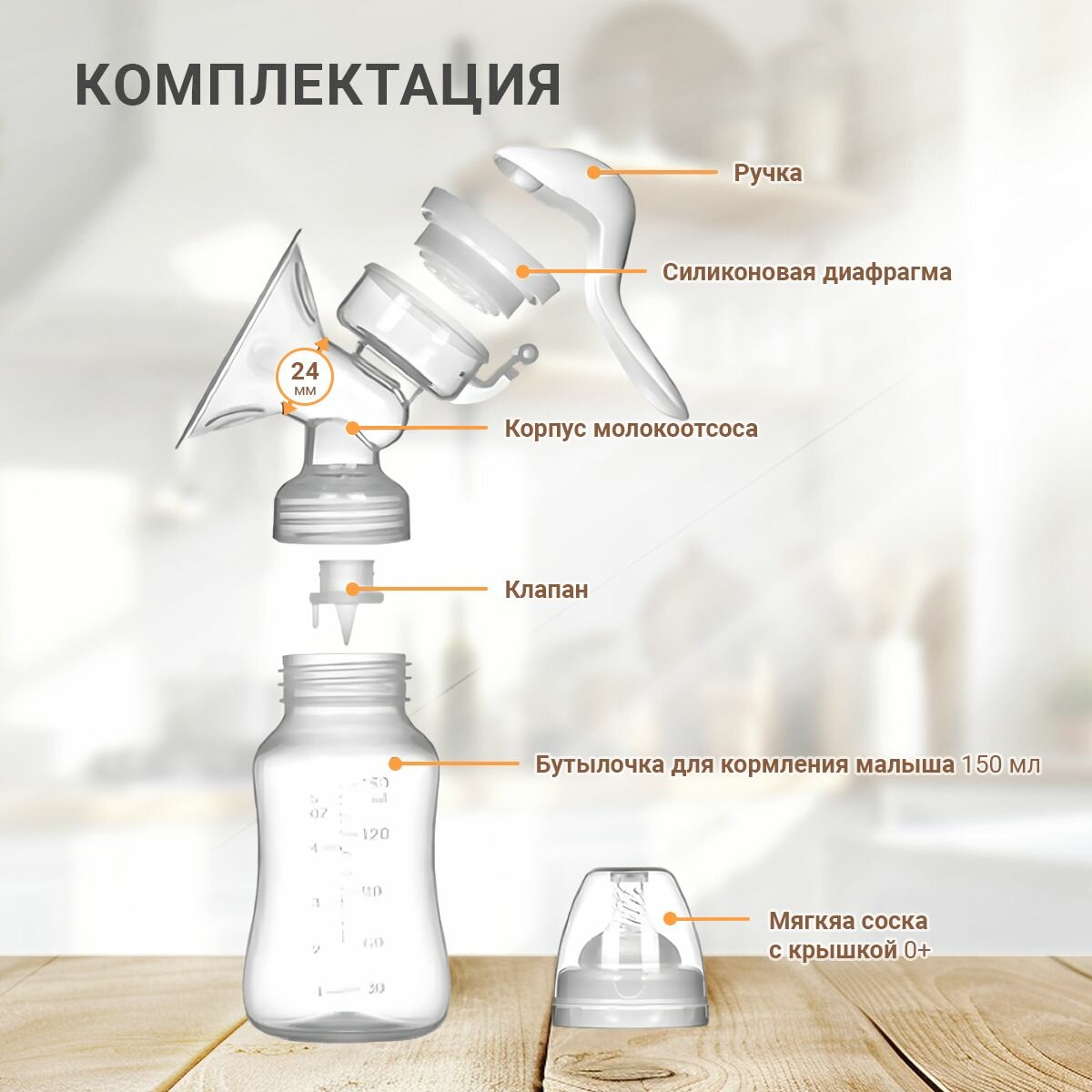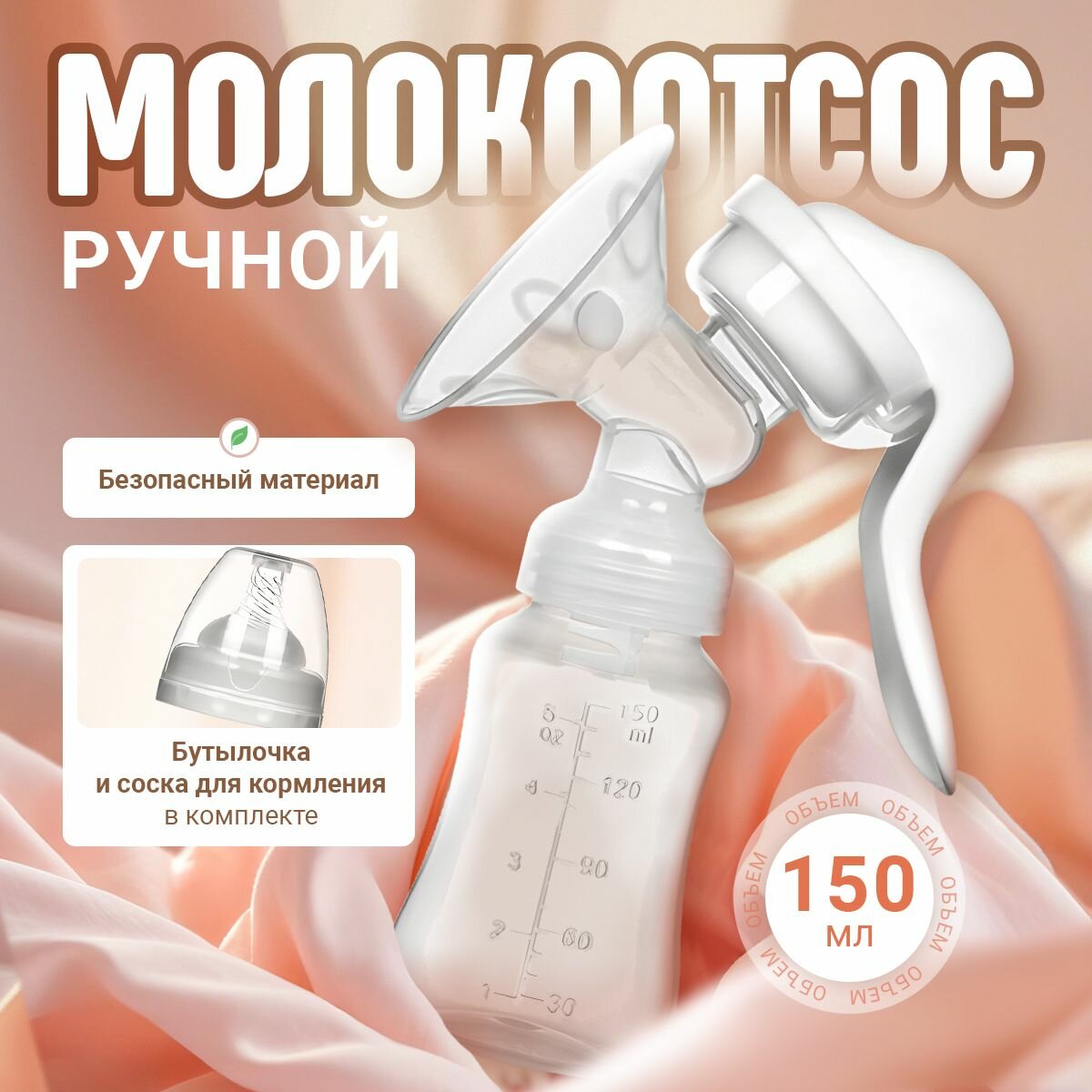 Молокоотсос ручной механический с бутылочкой для кормления ШГ и соской, 150 мл., цвет белый