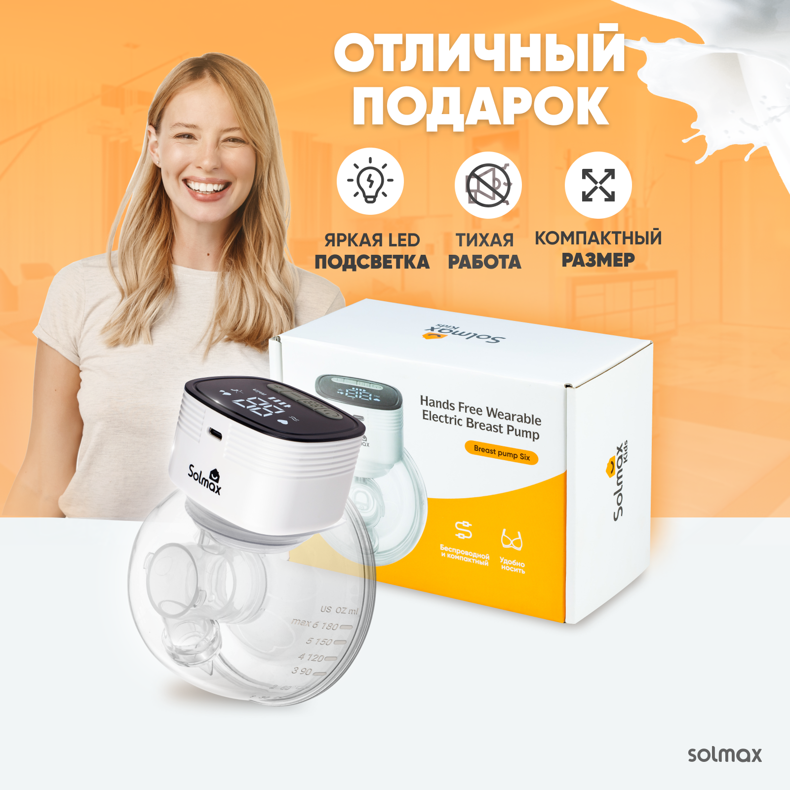Молокоотсос электрический Solmax с дисплеем беспроводной, 4 режима сцеживания свободные руки,9 уровней интенсивности интересное: