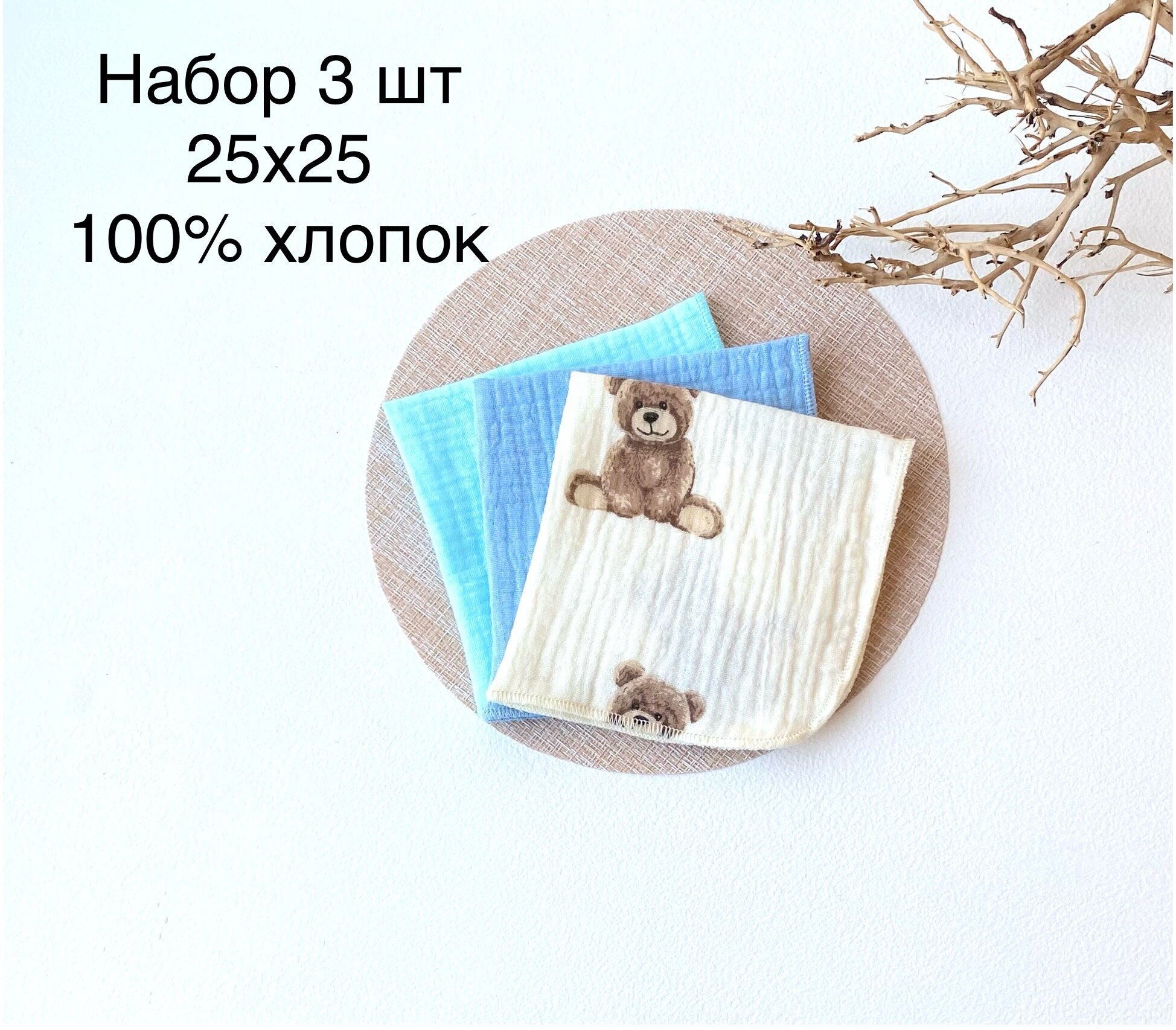 Набор платочков 3 шт Состав:100% хлопок, Цвет: голубой, бирюзовый, мишки интересное: