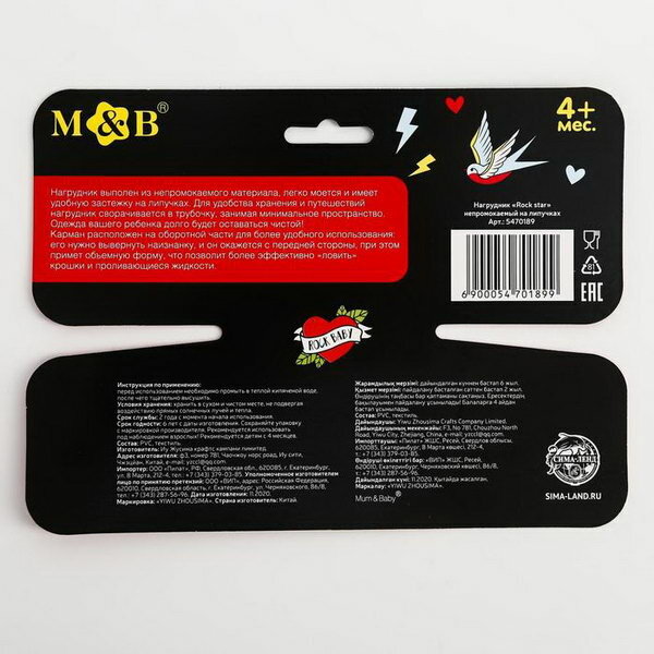 Нагрудник для кормления M&B "Rock star" непромокаемый на липучке, с карманом интересное: